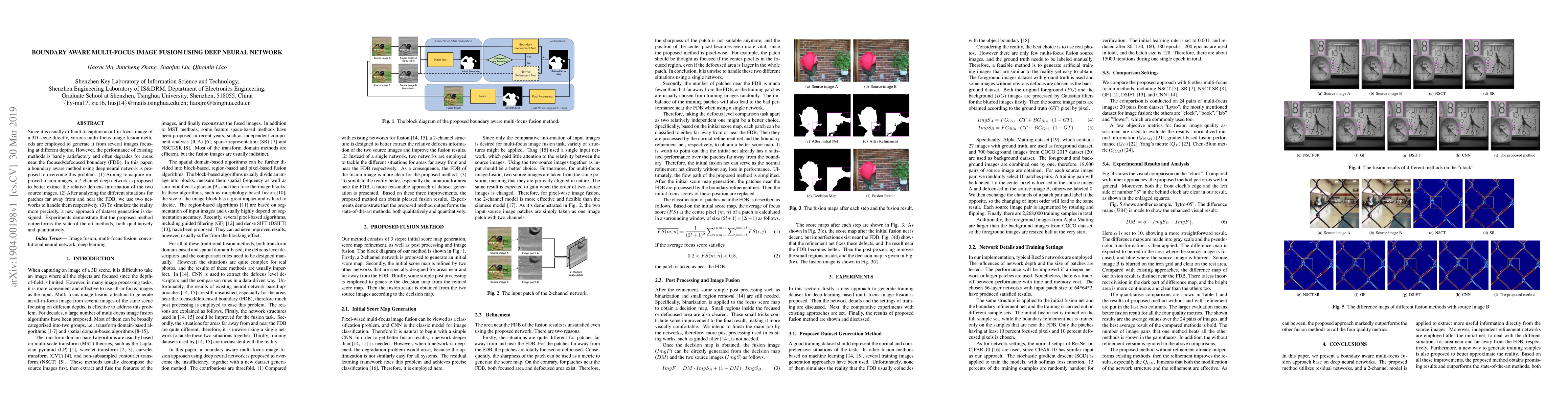 This paper proposes a deep neural network-based method for multi-focus image fusion that specifically addresses the degradation near focused/defocused boundaries. The method uses a 2-channel deep network to extract defocus information and employs separate networks for regions near and far from the boundary, achieving superior performance compared to existing techniques.