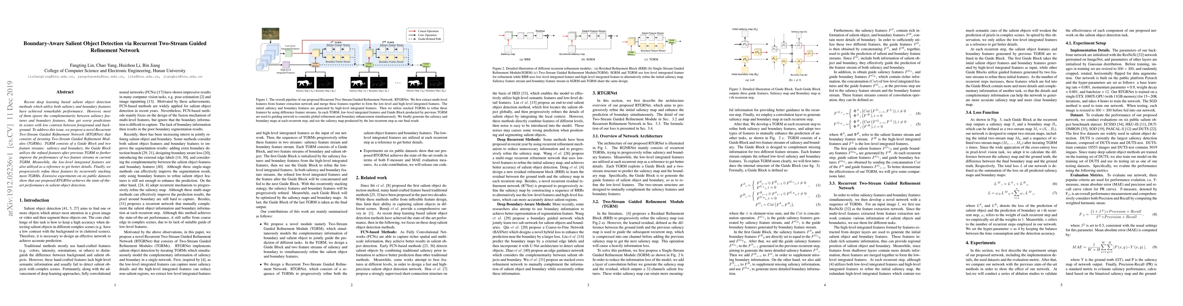 The paper proposes a Recurrent Two-Stream Guided Refinement Network (RTGRNet) to enhance salient object detection by iteratively refining saliency and boundary features. The RTGRNet uses Two-Stream Guided Refinement Modules (TGRMs) to progressively improve feature complementarity, leading to state-of-the-art performance on six public datasets.