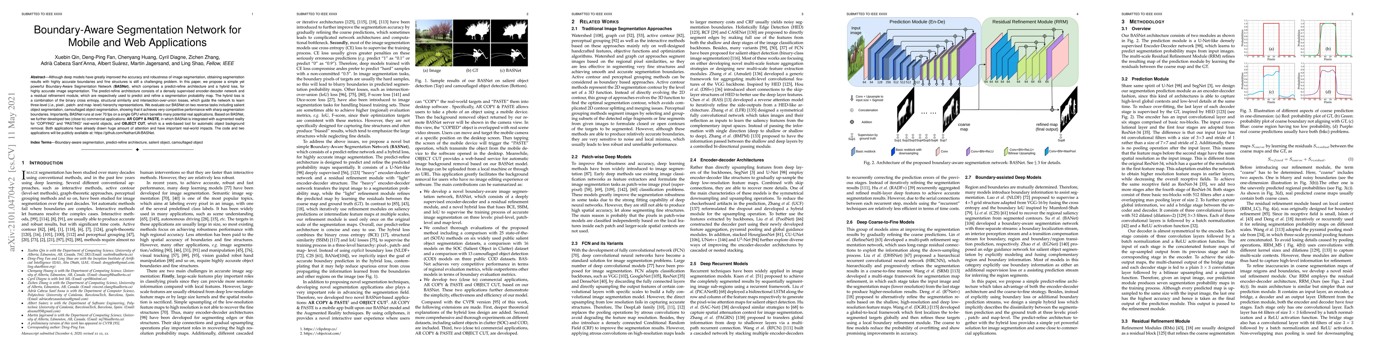 This paper introduces BASNet, a Boundary-Aware Segmentation Network that employs a predict-refine architecture and a hybrid loss for precise image segmentation. The network achieves sharp segmentation boundaries and runs efficiently at over 70 fps, enabling real-time applications like AR COPY & PASTE and OBJECT CUT.
