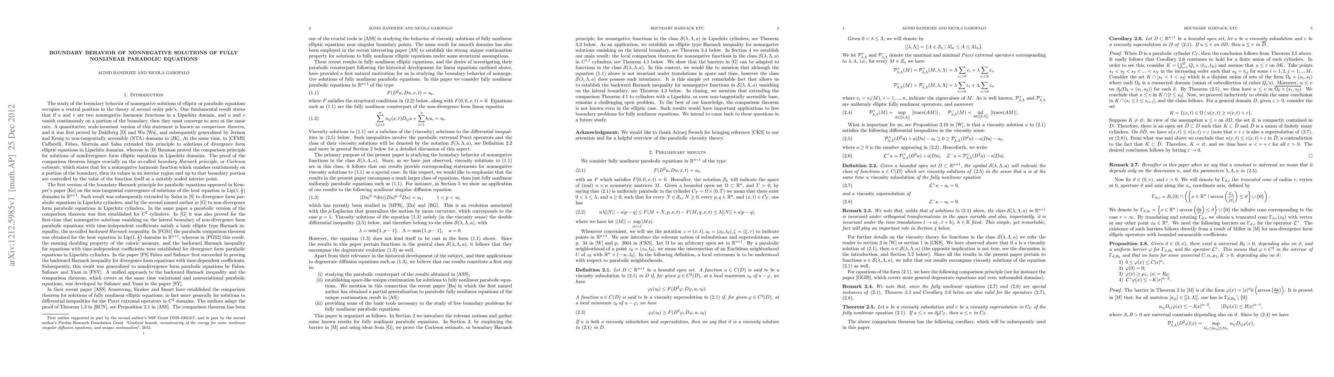 We study the boundary behavior of viscosity nonnegative solutions of fully nonlinear parabolic Pucci extremal operators. We establish local and global comparison theorems in $C^{1,1} cylinders, along with a backward Harnack inequality.
