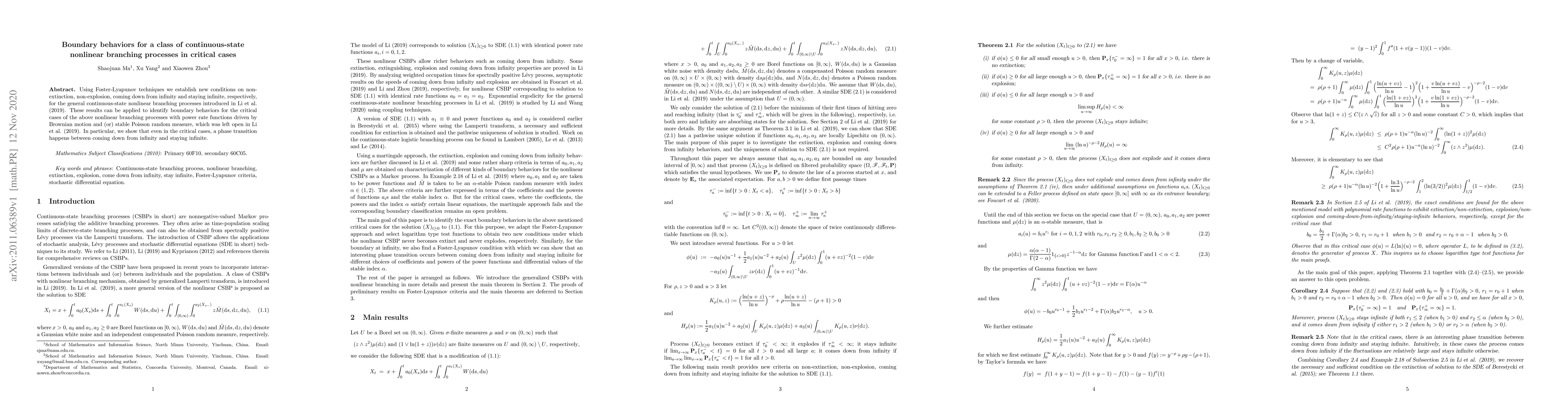 Using Foster-Lyapunov techniques we establish new conditions on non-extinction, non-explosion, coming down from infinity and staying infinite, respectively, for the general continuous-state nonlinear branching processes introduced in Li et al. (2019). These results can be applied to identify boundary behaviors for the critical cases of the above nonlinear branching processes with power rate functions driven by Brownian motion and (or) stable Poisson random measure, which was left open in Li et al. (2019). In particular, we show that even in the critical cases, a phase transition happens between coming down from infinity and staying infinite.