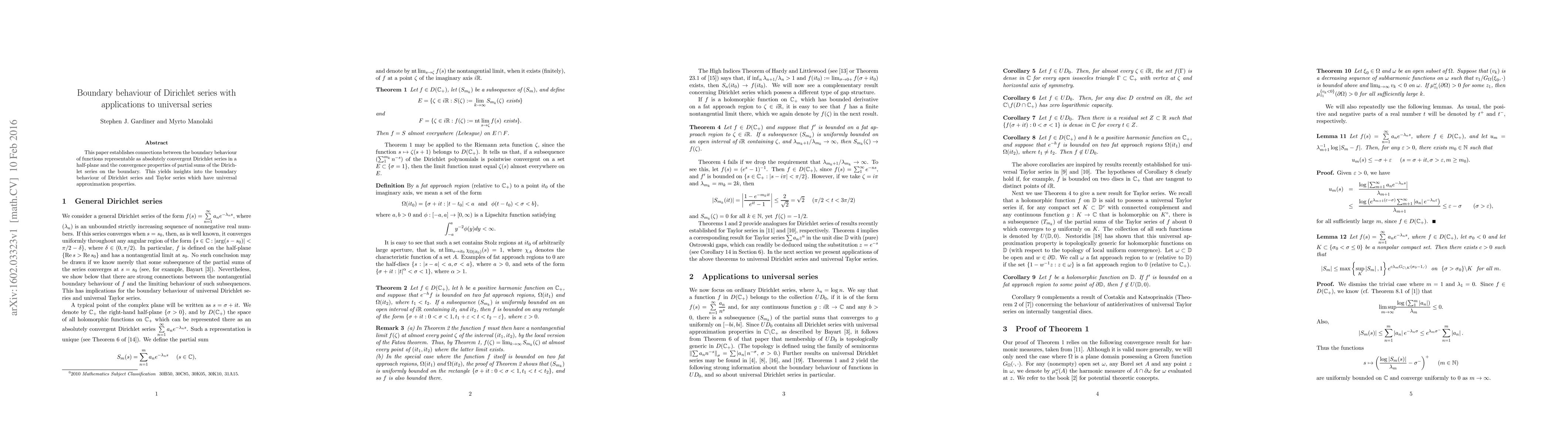 The paper presents novel theorems and propositions that connect the boundary behavior of Dirichlet series with their convergence properties, offering new insights into universal approximation series.