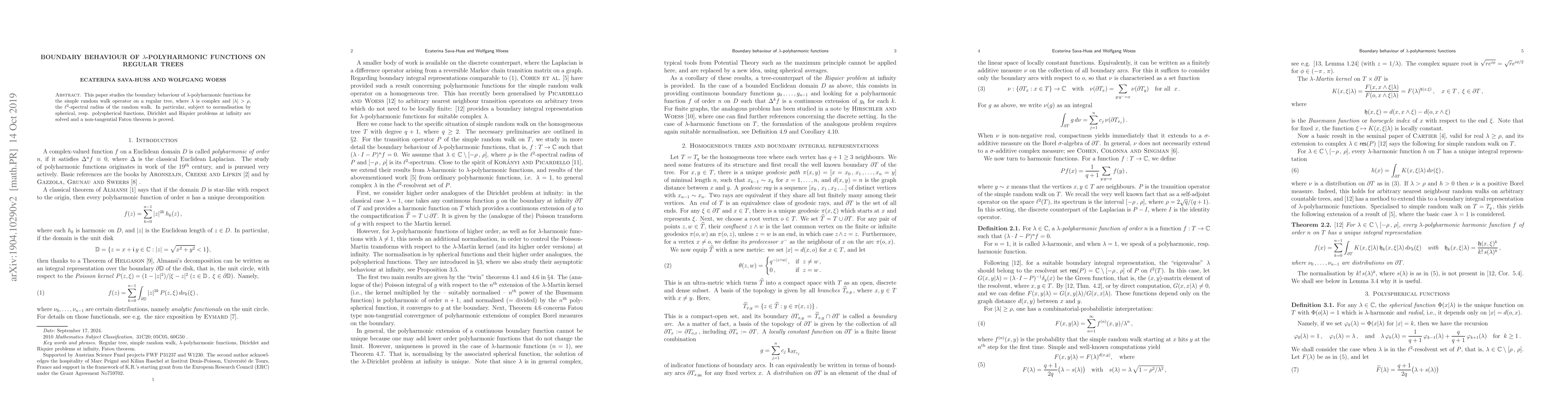 This paper studies the boundary behaviour of $\lambda$-polyharmonic functions for the simple random walk operator on a regular tree, where $\lambda$ is complex and $|\lambda|> \rho$, the $\ell^2$-spectral radius of the random walk. In particular, subject to normalisation by spherical, resp. polyspherical functions, Dirichlet and Riquier problems at infinity are solved and a non-tangential Fatou theorem is proved.