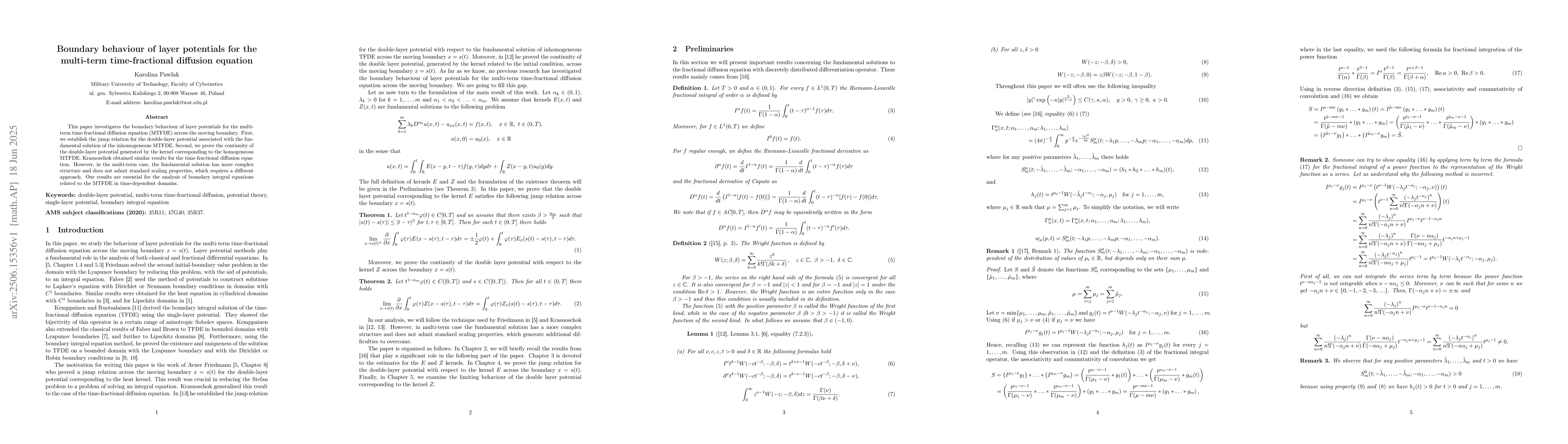 This paper investigates the boundary behaviour of layer potentials for the multi-term time-fractional diffusion equation (MTFDE) across the moving boundary. First, we establish the jump relation for the double-layer potential associated with the fundamental solution of the inhomogeneous MTFDE. Second, we prove the continuity of the double-layer potential generated by the kernel corresponding to the homogeneous MTFDE. Krasnoschok obtained similar results for the time-fractional diffusion equation. However, in the multi-term case, the fundamental solution has more complex structure and does not admit standard scaling properties, which requires a different approach. Our results are essential for the analysis of boundary integral equations related to the MTFDE in time-dependent domains.