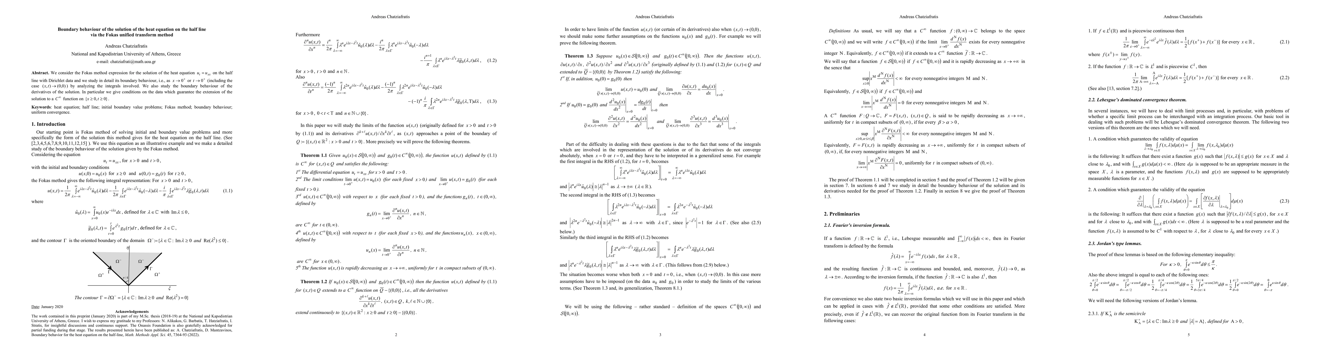 We consider the Fokas method expression for the solution of the heat equation on the half line with Dirichlet data and we study in detail its boundary behaviour near the spatiotemporal domain boundaries, i.e., the semi-axes, infinity and the origin, by analyzing the integrals involved. We also study the boundary behaviour of the derivatives of the solution. In particular we give conditions on the data which guarantee the extension of the solution to a smooth function up to the semi-infinite boundaries.