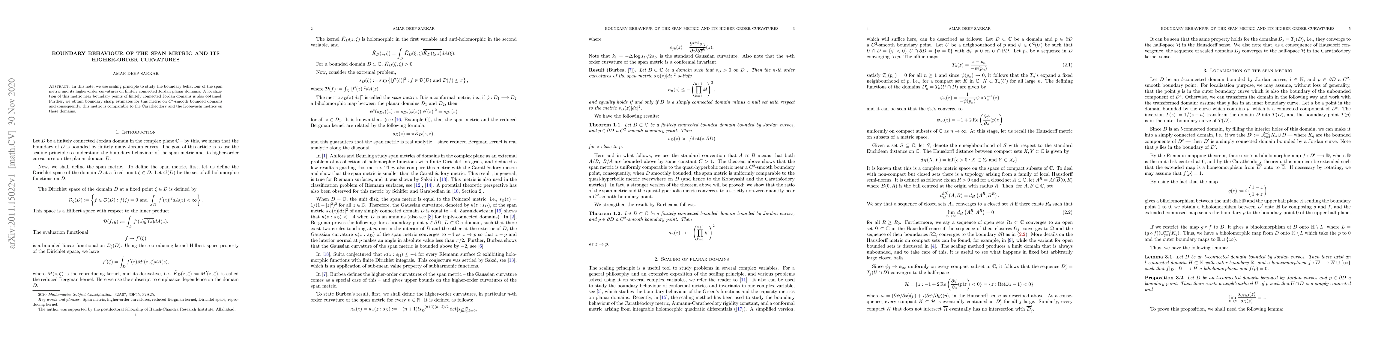 This paper explores the boundary behavior of the Span metric and its higher-order curvatures on finitely connected planar domains using a scaling principle. It also localizes this metric near boundary points and provides sharp boundary estimates for the Span metric on $C^2$-smooth bounded domains, comparing it to the Carathéodory and Kobayashi metrics.