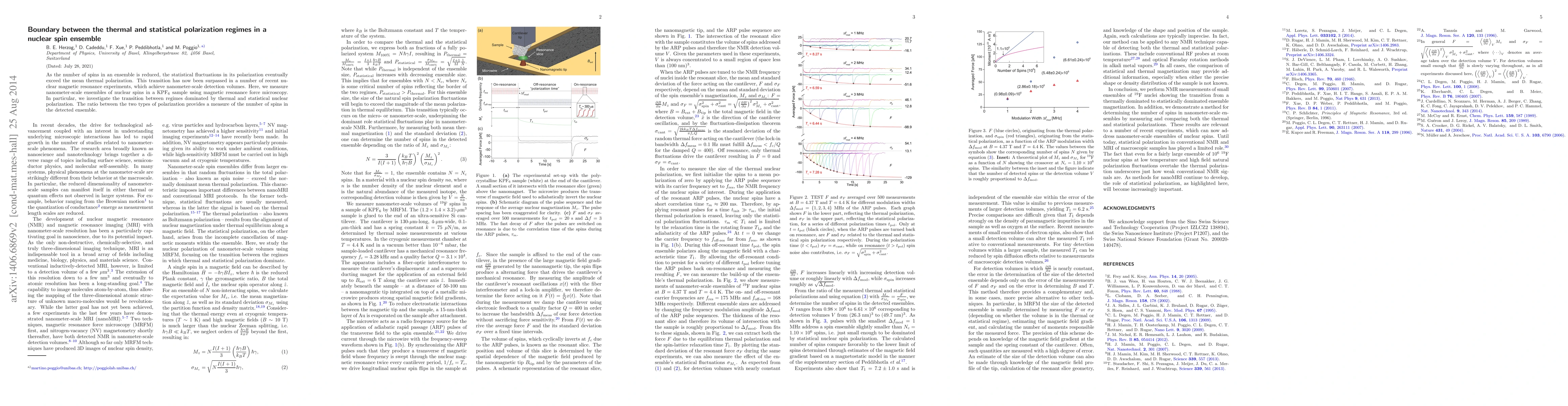 This paper investigates the transition between thermal and statistical polarization regimes in nuclear spin ensembles, achieved through nanometer-scale detection using magnetic resonance force microscopy in a KPF6 sample. The study measures the ratio of thermal to statistical polarization to determine the number of spins in the ensemble.