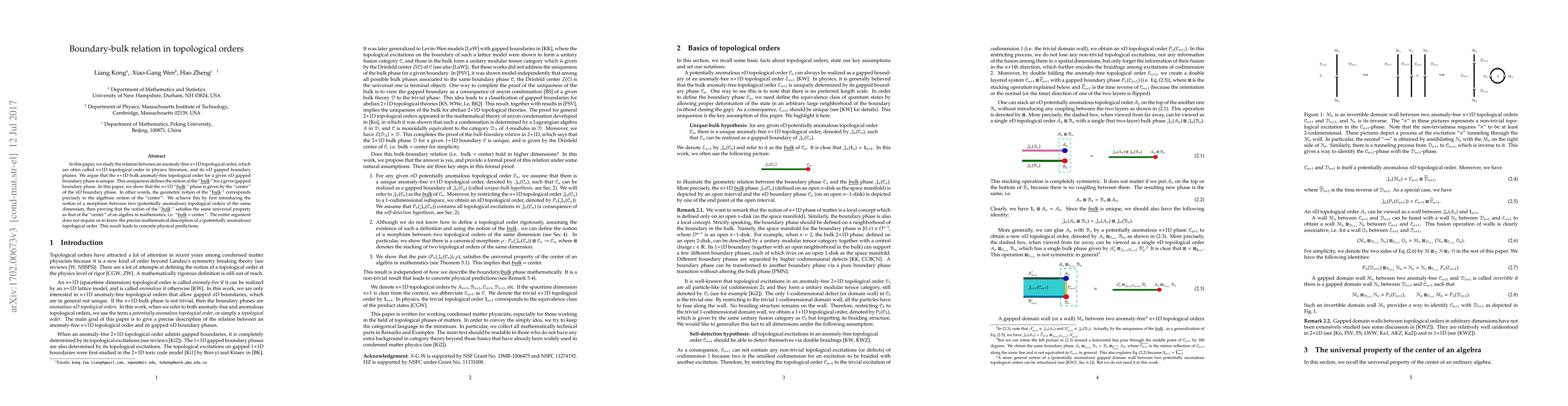 Researchers found that the 1D bulk of an n+1D topological order corresponds to its algebraic center, defining a unique notion of the bulk for a given gapped boundary phase.