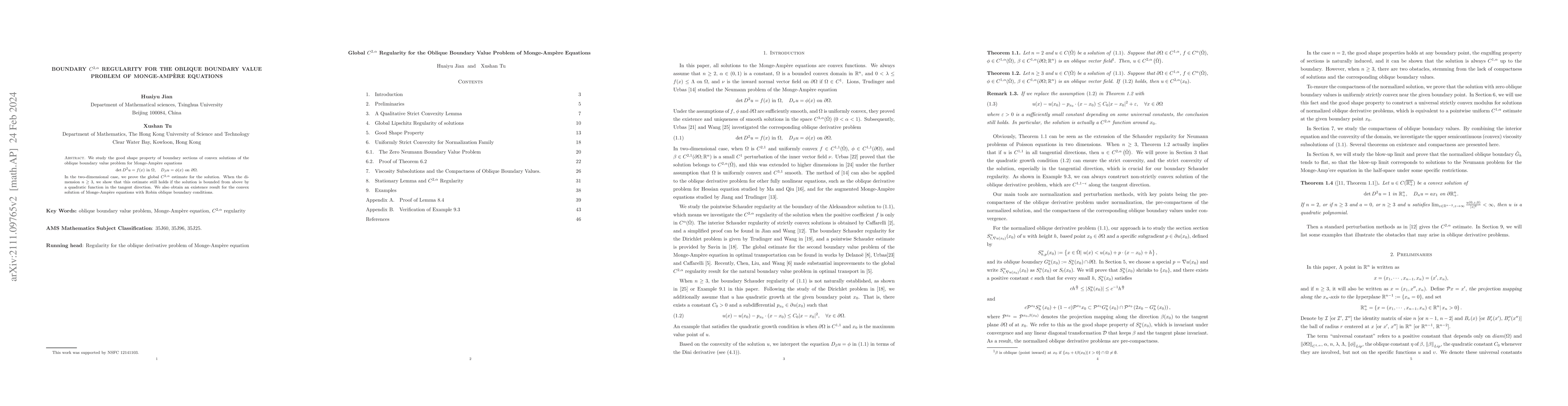 We study the good shape property of boundary sections of convex solutions of the oblique boundary value problem for Monge-Amp\`ere equations $$\det D^2u =f(x) \text{ in } \Omega , \quad D_{\beta}u = \phi(x) \text{ on } \partial \Omega.$$ In the two-dimensional case, we prove the global $C^{2,\alpha}$ estimate for the solution. When the dimension $n \geq 3$, we show that this estimate still holds if the solution is bounded from above by a quadratic function in the tangent direction. We also obtain an existence result for the convex solution of Monge-Amp\`ere equations with Robin oblique boundary conditions.