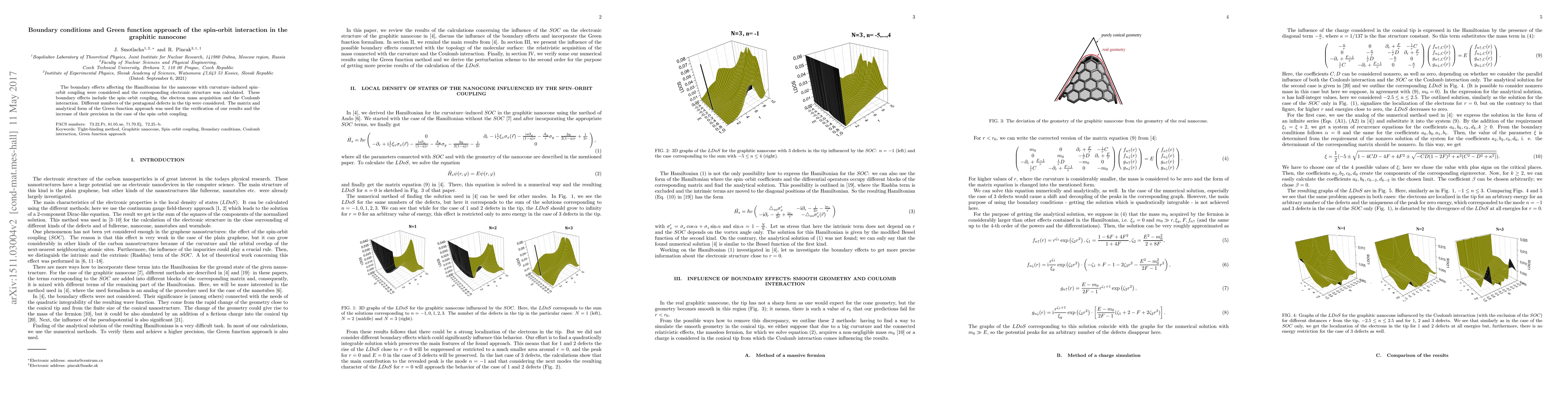 The boundary effects affecting the Hamiltonian for the nanocone with curvatureinduced spin orbit coupling were considered and the corresponding electronic structure was calculated. These boundary effects include the spin orbit coupling, the electron mass acquisition and the Coulomb interaction. Different numbers of the pentagonal defects in the tip were considered. The Green function approach into the second order was used for getting more precise results in the case of the spin orbit coupling.