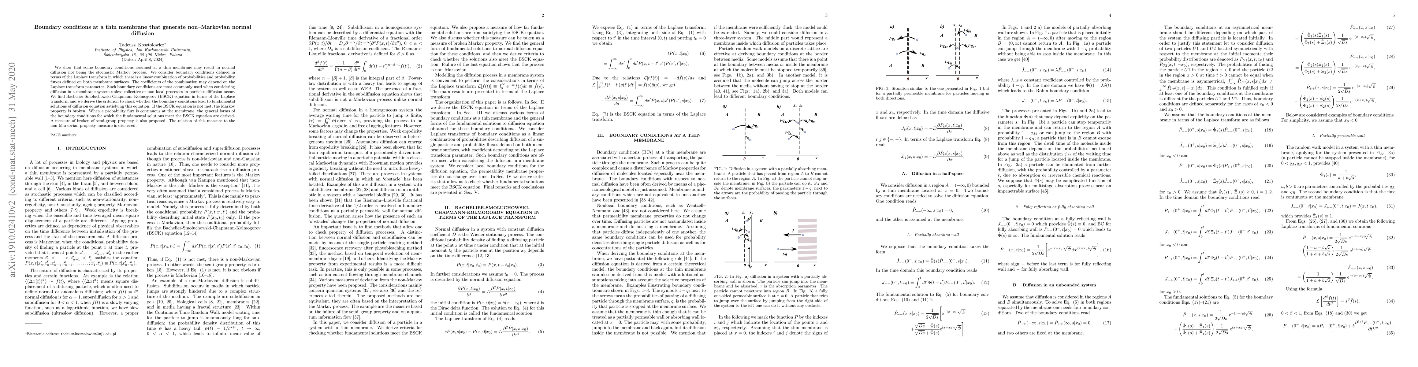 This paper investigates how specific boundary conditions on a thin membrane can lead to non-Markovian normal diffusion, breaking the stochastic Markov property. It derives the BSCK equation for Laplace transform-based boundary conditions and proposes a measure for the degree of broken semi-group property, linking it to the non-Markovian diffusion phenomenon.