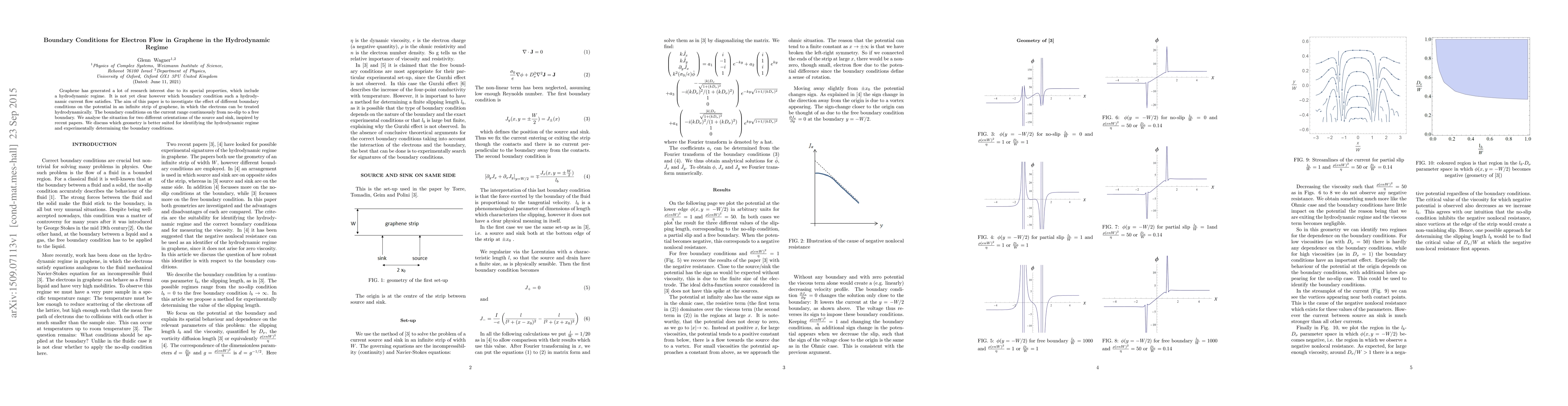 Graphene has generated a lot of research interest due to its special properties, which include a hydrodynamic regime. It is not yet clear however which boundary condition such a hydrodynamic current flow satisfies. The aim of this paper is to investigate the effect of different boundary conditions on the potential in an infinite strip of graphene, in which the electrons can be treated hydrodynamically. The boundary conditions on the current range continuously from no-slip to a free boundary. We analyse the situation for two different orientations of the source and sink, inspired by recent papers. We discuss which geometry is better suited for identifying the hydrodynamic regime and experimentally determining the boundary conditions.