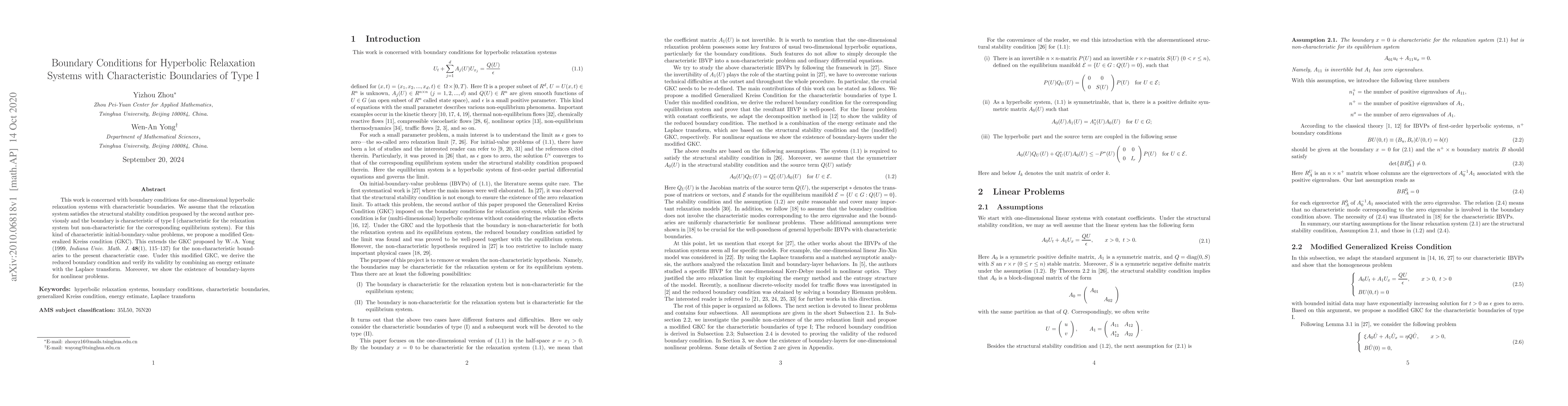 This research introduces a modified Generalized Kreiss Condition (GKC) for one-dimensional hyperbolic relaxation systems with characteristic boundaries of type I. It derives reduced boundary conditions, verifies their validity using energy estimates and Laplace transforms, and demonstrates the existence of boundary-layers for nonlinear problems.