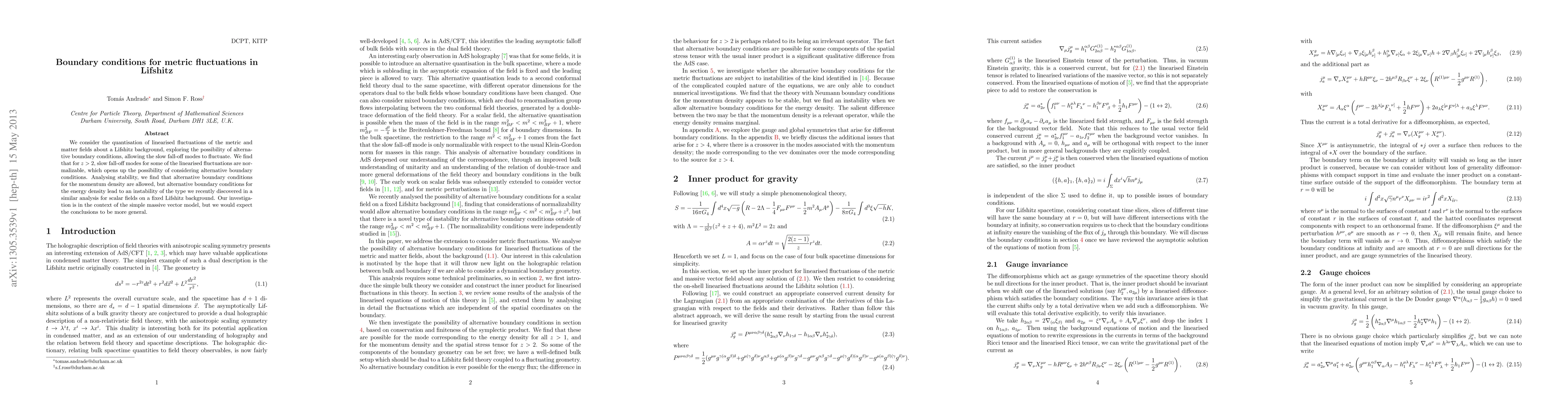 We consider the quantisation of linearised fluctuations of the metric and matter fields about a Lifshitz background, exploring the possibility of alternative boundary conditions, allowing the slow fall-off modes to fluctuate. We find that for $z >2$, slow fall-off modes for some of the linearised fluctuations are normalizable, which opens up the possibility of considering alternative boundary conditions. Analysing stability, we find that alternative boundary conditions for the momentum density are allowed, but alternative boundary conditions for the energy density lead to an instability of the type we recently discovered in a similar analysis for scalar fields on a fixed Lifshitz background. Our investigation is in the context of the simple massive vector model, but we would expect the conclusions to be more general.