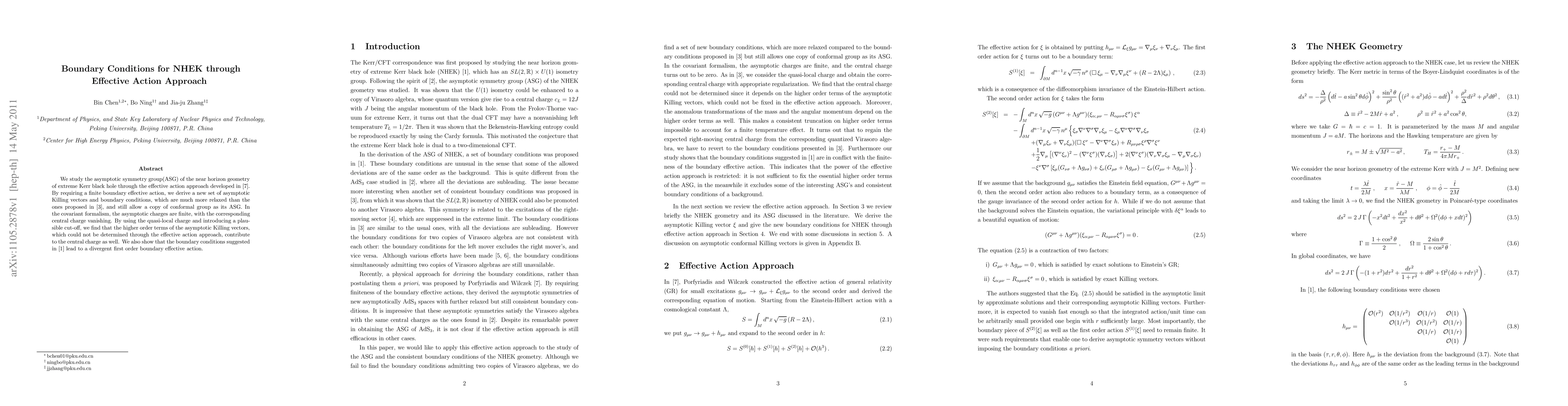 We study the asymptotic symmetry group(ASG) of the near horizon geometry of extreme Kerr black hole through the effective action approach developed in 1007.1031. By requiring a finite boundary effective action, we derive a new set of asymptotic Killing vectors and boundary conditions, which are much more relaxed than the ones proposed in 0907.0303, and still allow a copy of conformal group as its ASG. In the covariant formalism, the asymptotic charges are finite, with the corresponding central charge vanishing. By using the quasi-local charge and introducing a plausible cut-off, we find that the higher order terms of the asymptotic Killing vectors, which could not be determined through the effective action approach, contribute to the central charge as well. We also show that the boundary conditions suggested in 0809.4266 lead to a divergent first order boundary effective action.
