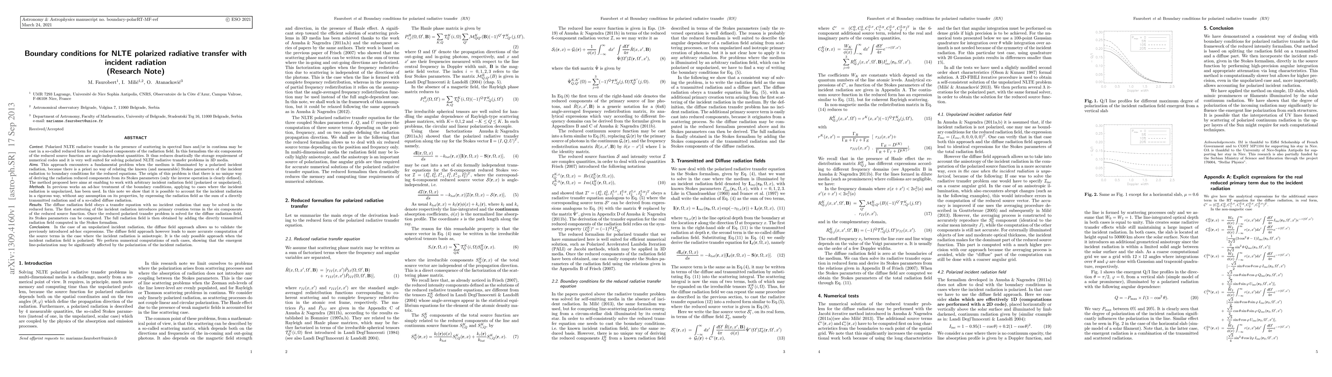 This paper presents a method to rigorously handle boundary conditions for polarized non-LTE radiative transfer when an incident polarized radiation is present. It introduces a decomposition of the radiation field into directly transmitted and diffuse components to solve the transfer equations, demonstrating significant effects on emergent line-polarization.