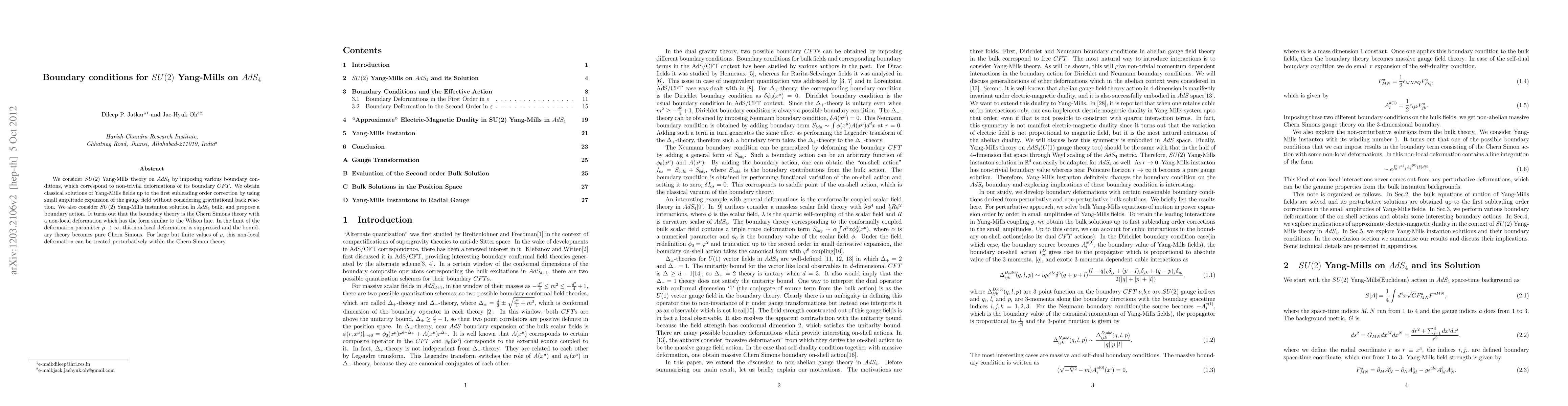We consider SU(2) Yang-Mills theory on $AdS_4$ by imposing various boundary conditions, which correspond to non-trivial deformations of its boundary $CFT$. We obtain classical solutions of Yang-Mills fields up to the first subleading order correction by using small amplitude expansion of the gauge field without considering gravitational back reaction. We also consider SU(2) Yang-Mills instanton solution in $AdS_4$ bulk, and propose a boundary action. It turns out that the boundary theory is the Chern Simons theory with a non-local deformation which has the form similar to the Wilson line. In the limit of the deformation parameter $\rho \rightarrow \infty$, this non-local deformation is suppressed and the boundary theory becomes pure Chern Simons. For large but finite values of $\rho$, this non-local deformation can be treated perturbatively within the Chern-Simon theory.