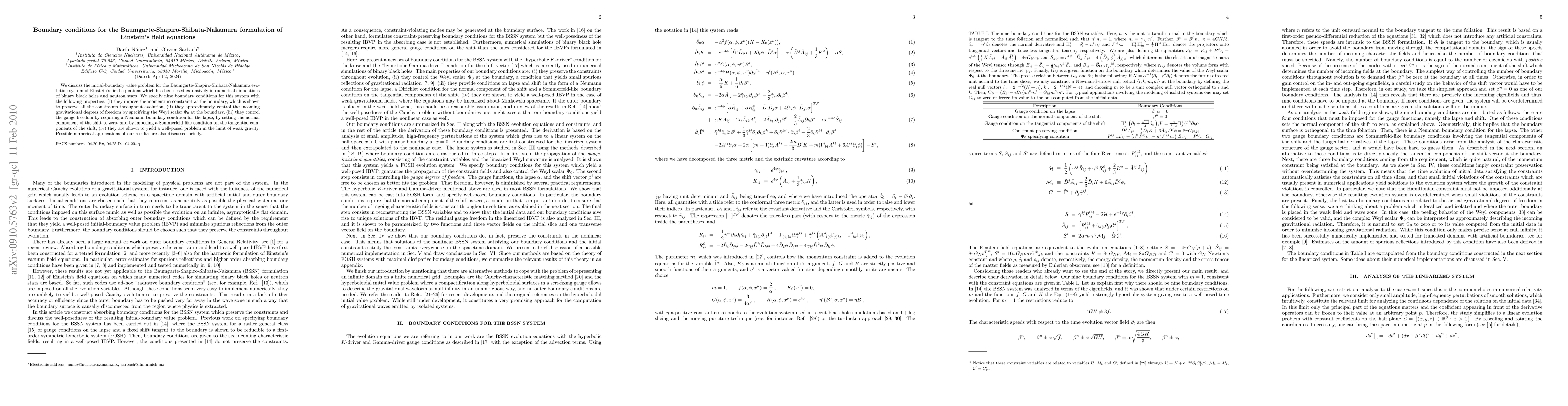 This paper specifies nine boundary conditions for the Baumgarte-Shapiro-Shibata-Nakamura formulation of Einstein's field equations, which preserve constraints and control gravitational degrees of freedom, gauge freedom, and ensure a well-posed problem in weak gravity scenarios. The conditions are also briefly discussed in the context of numerical simulations of binary black holes and neutron stars.