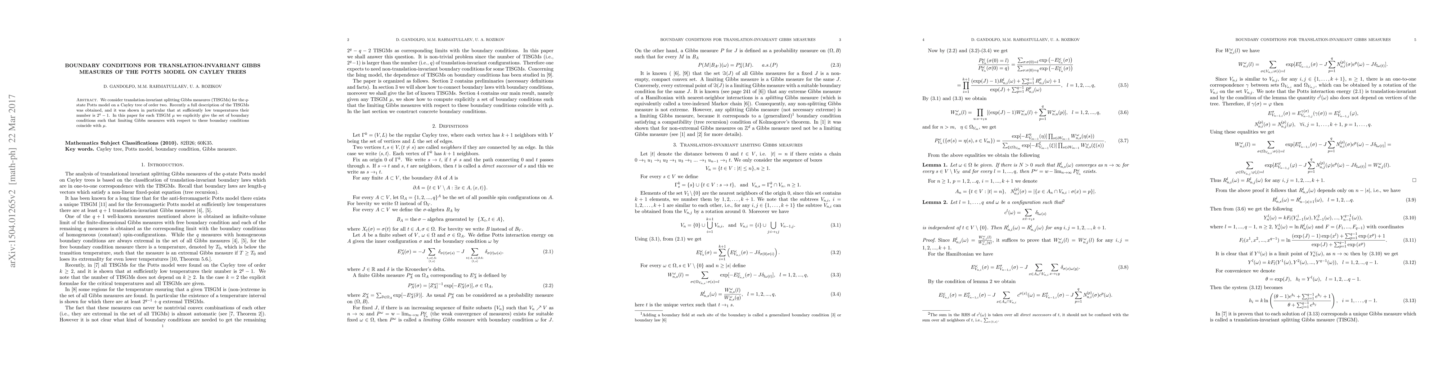 This paper provides an explicit set of boundary conditions for each translation-invariant splitting Gibbs measure (TISGM) of the $q$-state Potts model on a Cayley tree of order two. It shows that at low temperatures, the number of TISGMs is $2^{q}-1$, and identifies boundary conditions that yield limiting Gibbs measures equivalent to each TISGM.