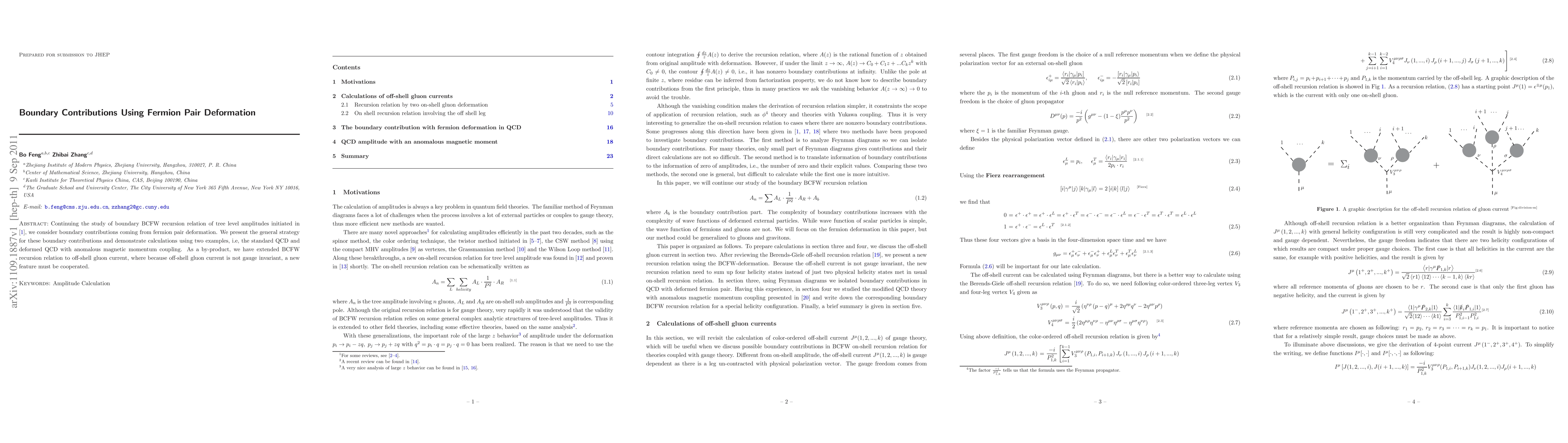 Continuing the study of boundary BCFW recursion relation of tree level amplitudes initiated in \cite{Feng:2009ei}, we consider boundary contributions coming from fermion pair deformation. We present the general strategy for these boundary contributions and demonstrate calculations using two examples, i.e, the standard QCD and deformed QCD with anomalous magnetic momentum coupling. As a by-product, we have extended BCFW recursion relation to off-shell gluon current, where because off-shell gluon current is not gauge invariant, a new feature must be cooperated.