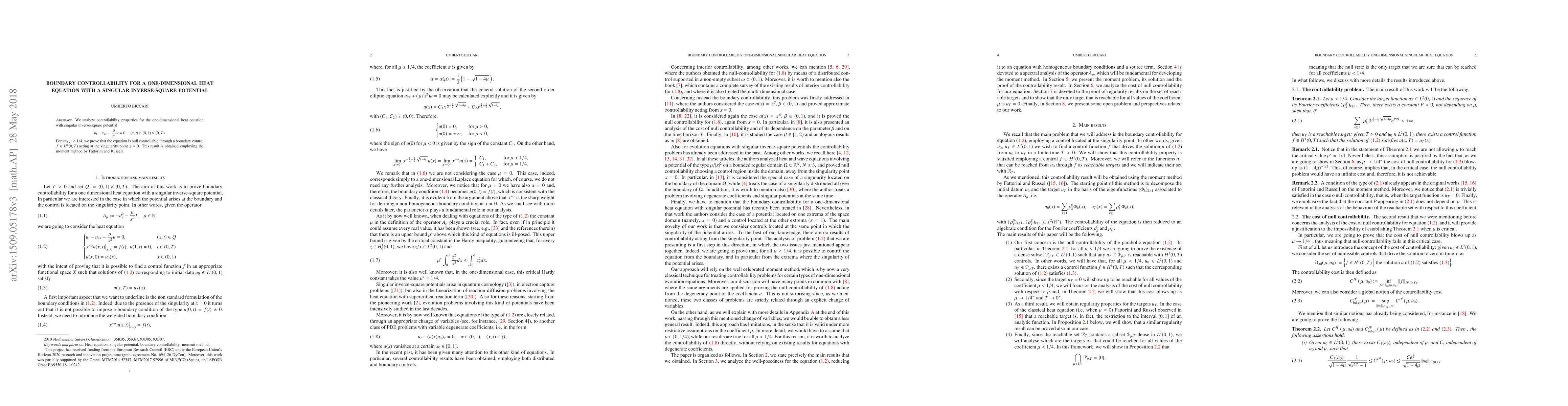 This paper proves boundary controllability for the one-dimensional heat equation with a singular inverse-square potential, demonstrating null controllability for any $\mu<1/4$ using the moment method by Fattorini and Russell. The control acts at the singularity point $x=0$.