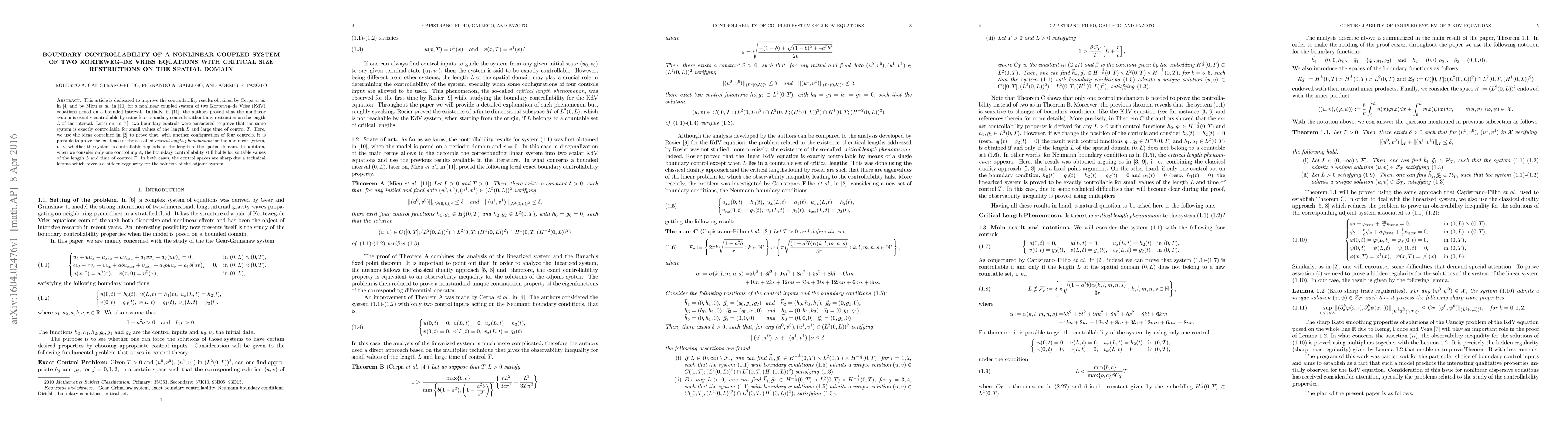 This paper enhances controllability results for a nonlinear coupled system of two Korteweg-de Vries equations, demonstrating that the system's controllability depends on the spatial domain's length, introducing a critical length phenomenon. It also shows that with only one control input, boundary controllability remains feasible under specific conditions.