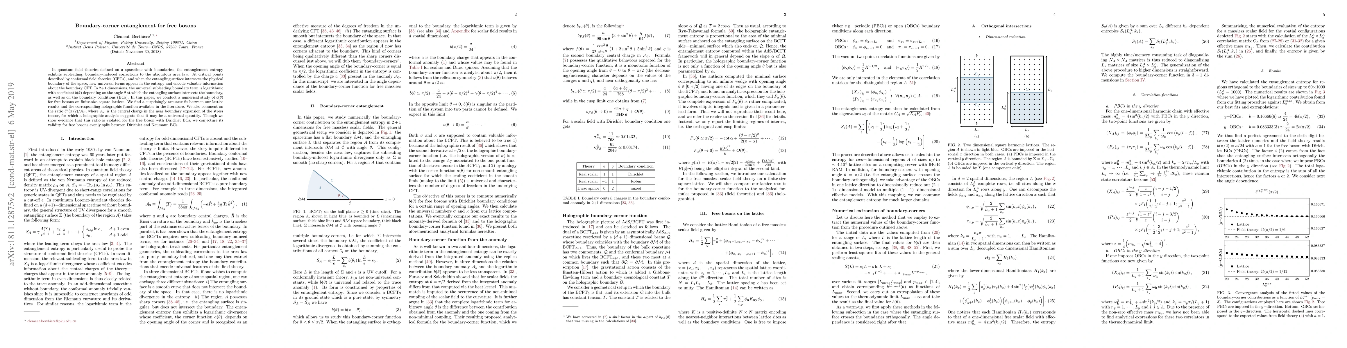 Development of a numerical method to compute boundary-corner entanglement entropy for free bosons on lattice, providing a detailed comparison with holographic predictions.