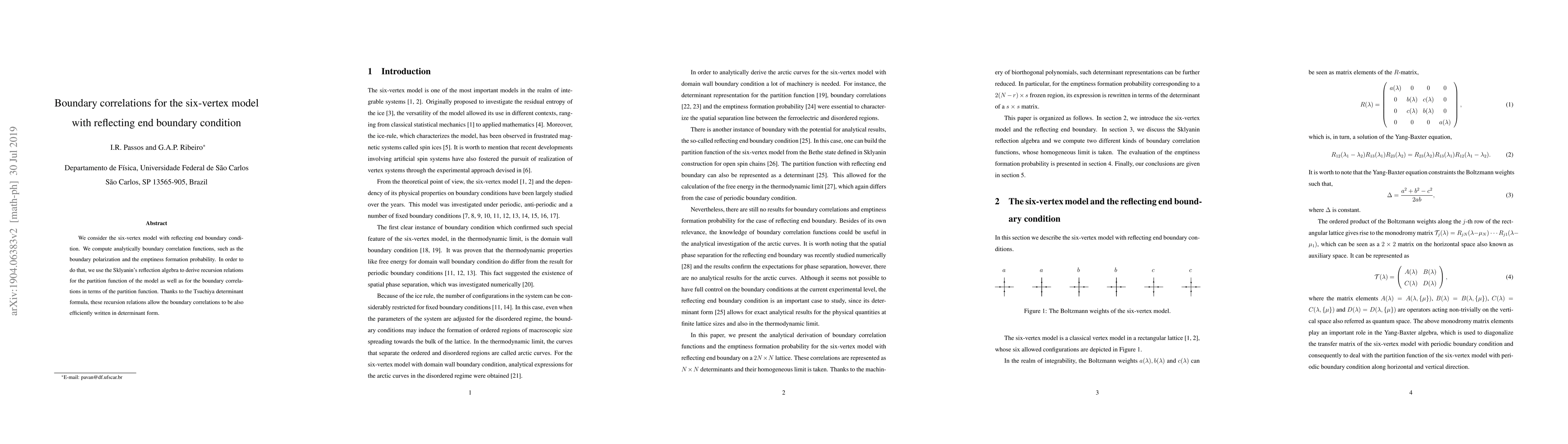 We consider the six-vertex model with reflecting end boundary condition. We compute analytically boundary correlation functions, such as the boundary polarization and the emptiness formation probability. In order to do that, we use the Sklyanin's reflection algebra to derive recursion relations for the partition function of the model as well as for the boundary correlations in terms of the partition function. Thanks to the Tsuchiya determinant formula, these recursion relations allow the boundary correlations to be also efficiently written in determinantal form.