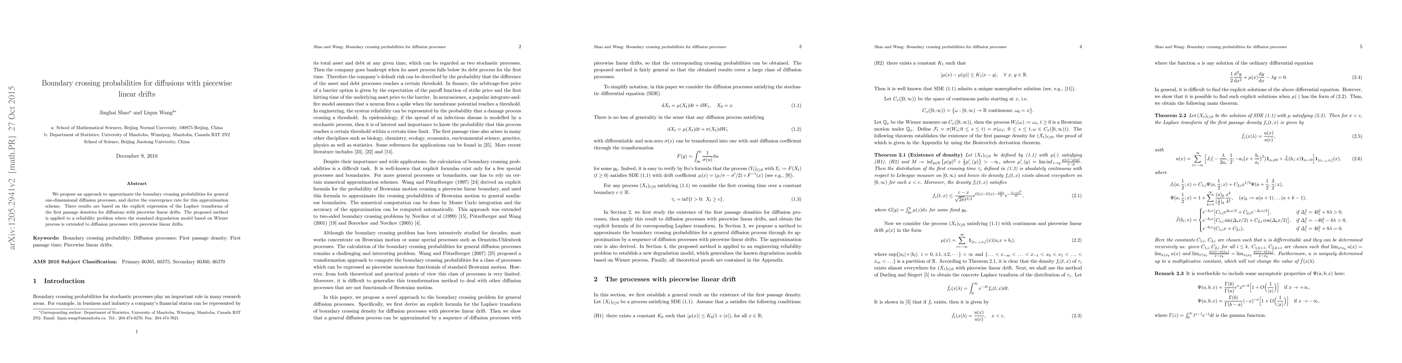 This paper proposes an approximation method for boundary crossing probabilities in one-dimensional diffusion processes with piecewise linear drifts, deriving its convergence rate. The method is applied to a reliability problem extending the standard Wiener process degradation model.