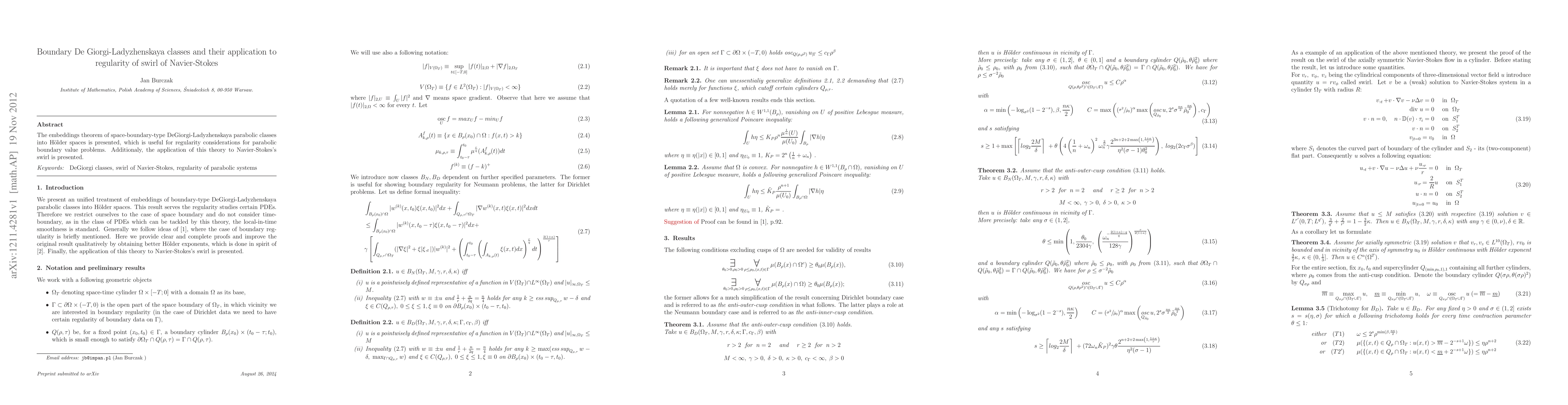 The embeddings theorem of space-boundary-type DeGiorgi-Ladyzhenskaya parabolic classes into Holder spaces is presented, which is useful for regularity considerations for parabolic boundary value problems. Additionaly, the application of this theory to Navier-Stokes-s swirl is presented.