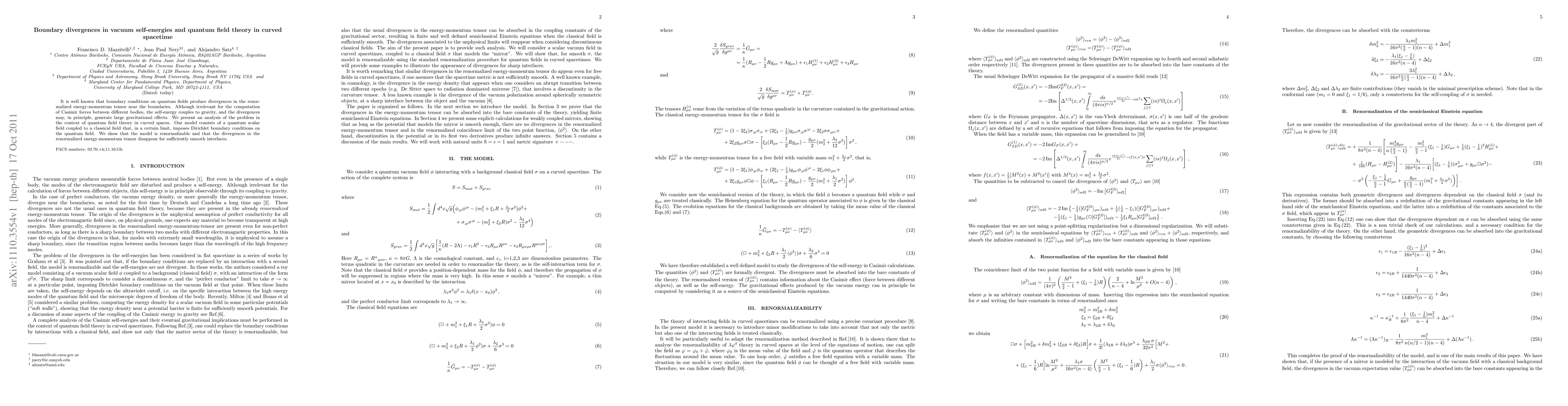 This paper analyzes boundary divergences in vacuum self-energies within quantum field theory in curved spacetime, focusing on how these divergences affect the renormalized energy-momentum tensor. The authors demonstrate that while these divergences are renormalizable and vanish for smooth interfaces, they could potentially generate significant gravitational effects.