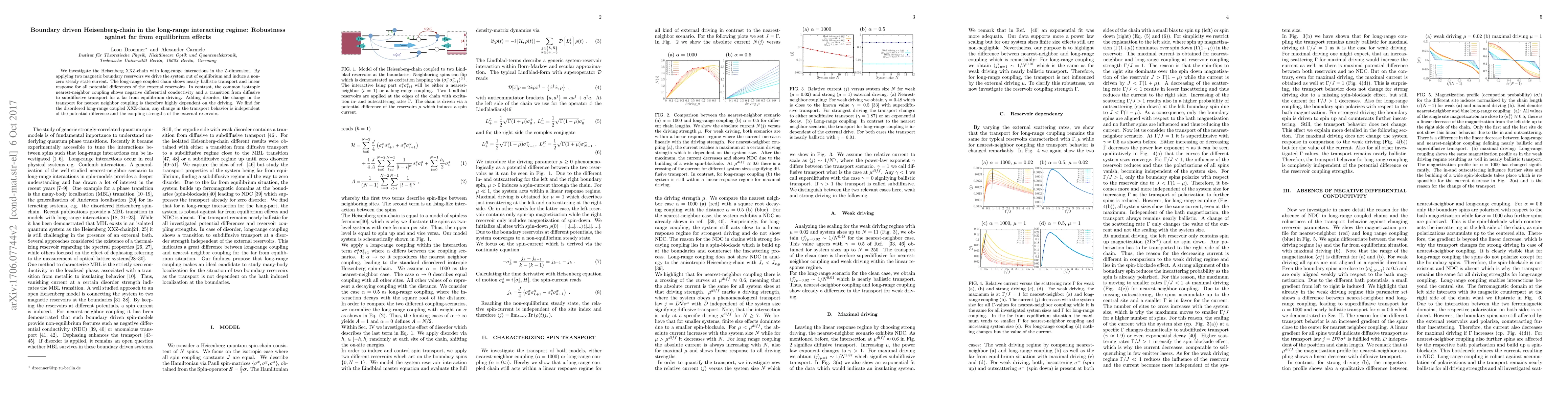 We investigate the Heisenberg XXZ-chain with long-range interactions in the Z-dimension. By applying two magnetic boundary reservoirs we drive the system out of equilibrium and induce a non-zero steady state current. The long-range coupled chain shows nearly ballistic transport and linear response for all potential differences of the external reservoirs. In contrast, the common isotropic nearest-neighbor coupling shows negative differential conductivity and a transition from diffusive to subdiffusive transport for a far from equilibrium driving. Adding disorder, the change in the transport for nearest neighbor coupling is therefore highly dependent on the driving. We find for the disordered long-range coupled XXZ-chain, any change in the transport behavior is independent of the potential difference and the coupling strengths of the external reservoirs.