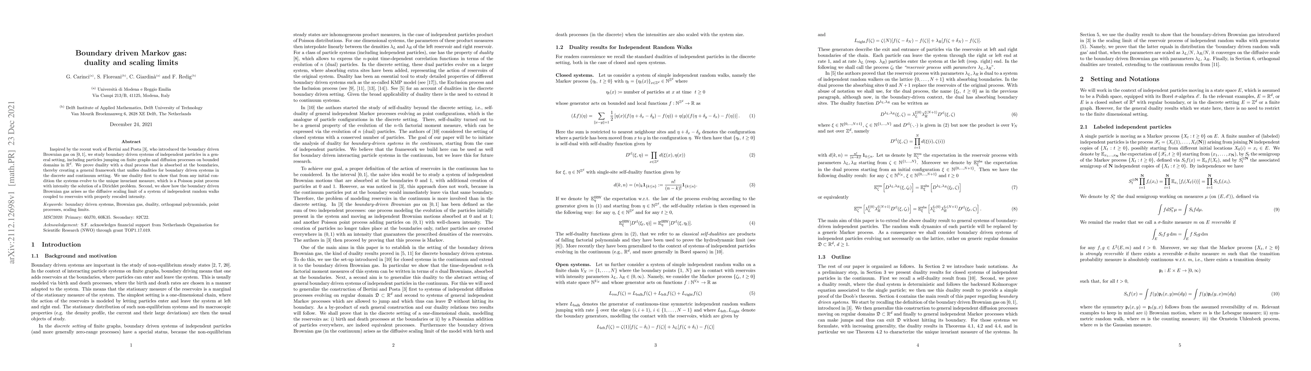 This paper studies boundary driven Markov processes, proving a duality that unifies dualities in discrete and continuum settings. It demonstrates that these systems converge to a unique invariant measure and identifies the boundary driven Brownian gas as the scaling limit of coupled random walks.