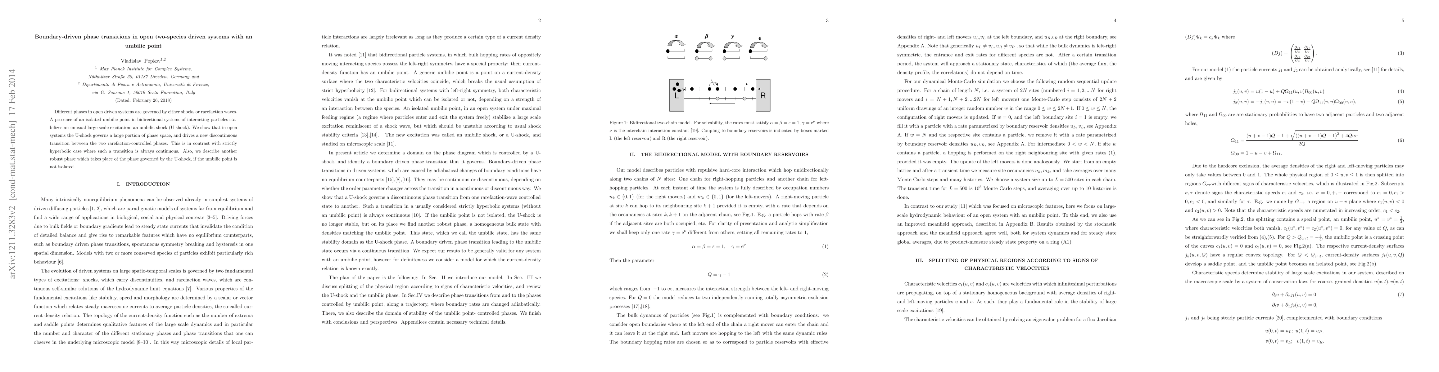 Different phases in open driven systems are governed by either shocks or rarefaction waves. A presence of an isolated umbilic point in bidirectional systems of interacting particles stabilizes an unusual large scale excitation, an umbilic shock (U-shock). We show that in open systems the U-shock governs a large portion of phase space, and drives a new discontinuous transition between the two rarefaction-controlled phases. This is in contrast with strictly hyperbolic case where such a transition is always continuous. Also, we describe another robust phase which takes place of the phase governed by the U-shock, if the umbilic point is not isolated.