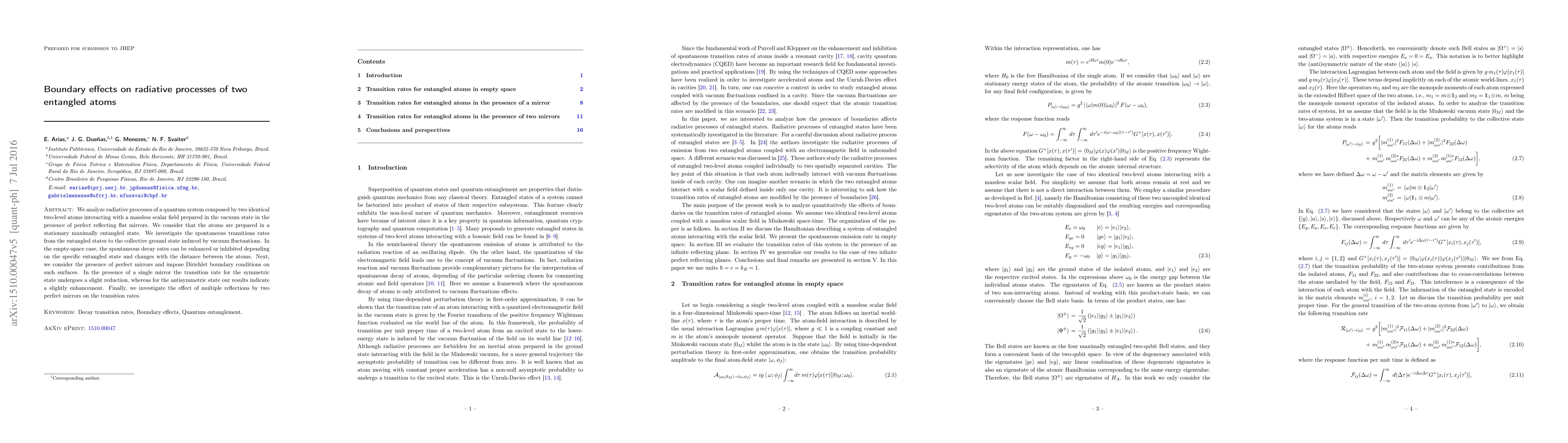 This paper examines the radiative processes of two entangled atoms interacting with a vacuum scalar field in the presence of reflecting mirrors. The study finds that the transition rates from entangled states to the collective ground state are influenced by the boundary conditions imposed by the mirrors, showing varying effects depending on the entangled state and the atoms' distance.