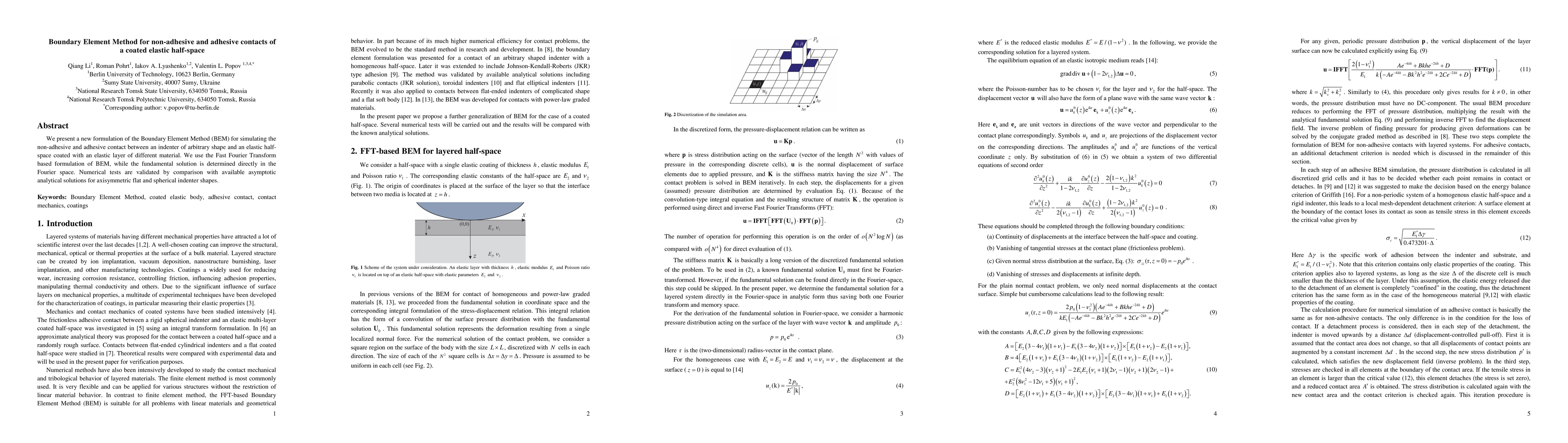 This paper introduces a new Boundary Element Method (BEM) formulation for simulating both non-adhesive and adhesive contacts between an indenter and an elastic half-space coated with a different elastic layer. The method employs Fast Fourier Transform for efficiency, and numerical tests are validated against analytical solutions.