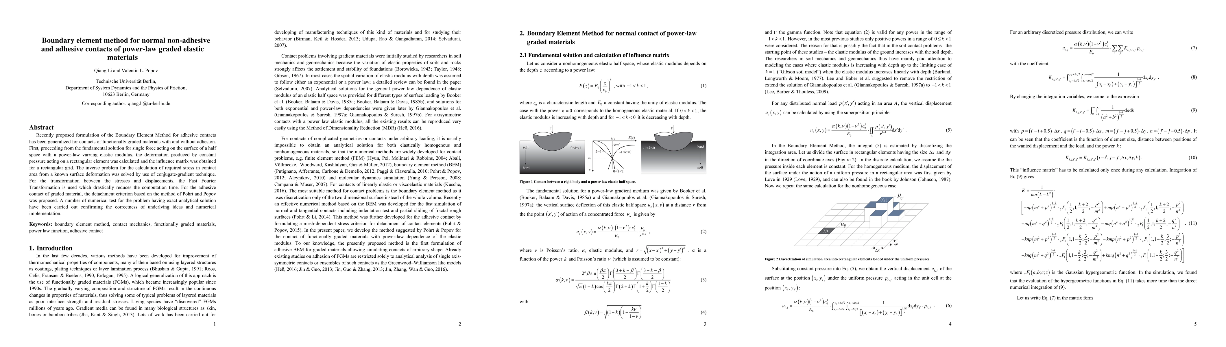 This paper generalizes the Boundary Element Method for analyzing normal contacts of power-law graded elastic materials, both adhesive and non-adhesive. It employs a conjugate-gradient technique for solving the inverse problem and uses Fast Fourier Transformation to reduce computation time, validated through numerical tests.
