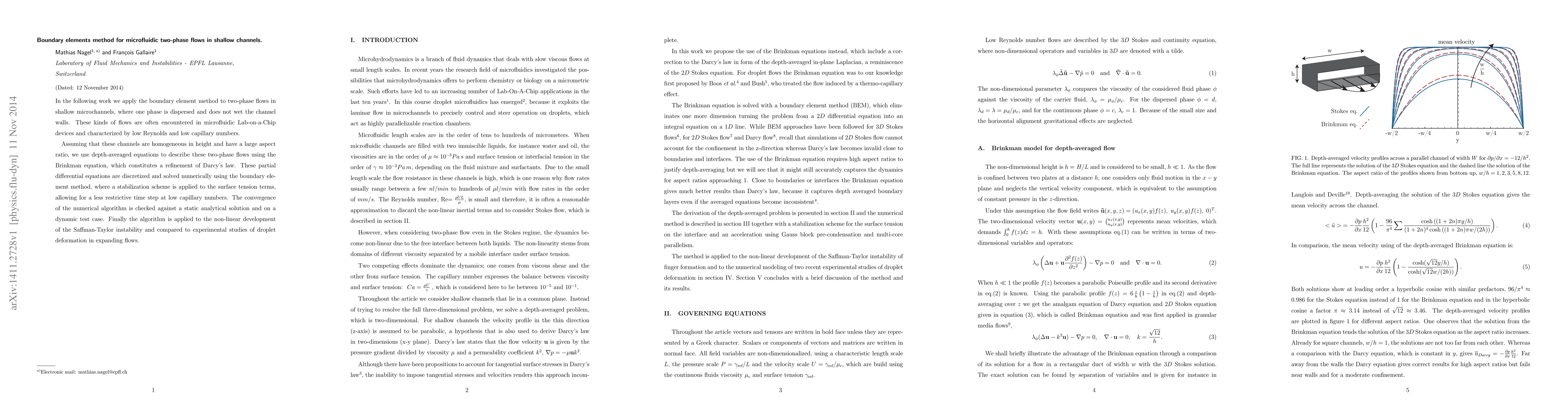 In the following work we apply the boundary element method to two-phase flows in shallow microchannels, where one phase is dispersed and does not wet the channel walls. These kinds of flows are often encountered in microfluidic Lab-on-a-Chip devices and characterized by low Reynolds and low capillary numbers. Assuming that these channels are homogeneous in height and have a large aspect ratio, we use depth-averaged equations to describe these two-phase flows using the Brinkman equation, which constitutes a refinement of Darcy's law. These partial differential equations are discretized and solved numerically using the boundary element method, where a stabilization scheme is applied to the surface tension terms, allowing for a less restrictive time step at low capillary numbers. The convergence of the numerical algorithm is checked against a static analytical solution and on a dynamic test case. Finally the algorithm is applied to the non-linear development of the Saffman-Taylor instability and compared to experimental studies of droplet deformation in expanding flows.
