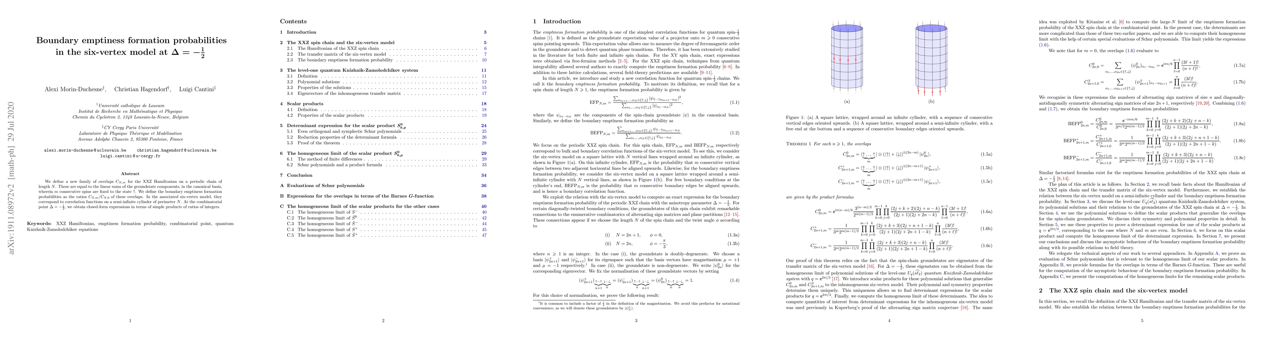 We define a new family of overlaps $C_{N,m}$ for the XXZ Hamiltonian on a periodic chain of length $N$. These are equal to the linear sums of the groundstate components, in the canonical basis, wherein $m$ consecutive spins are fixed to the state ${\uparrow}$. We define the boundary emptiness formation probabilities as the ratios $C_{N,m}/C_{N,0}$ of these overlaps. In the associated six-vertex model, they correspond to correlation functions on a semi-infinite cylinder of perimeter $N$. At the combinatorial point $\Delta = -\frac12$, we obtain closed-form expressions in terms of simple products of ratios of integers.