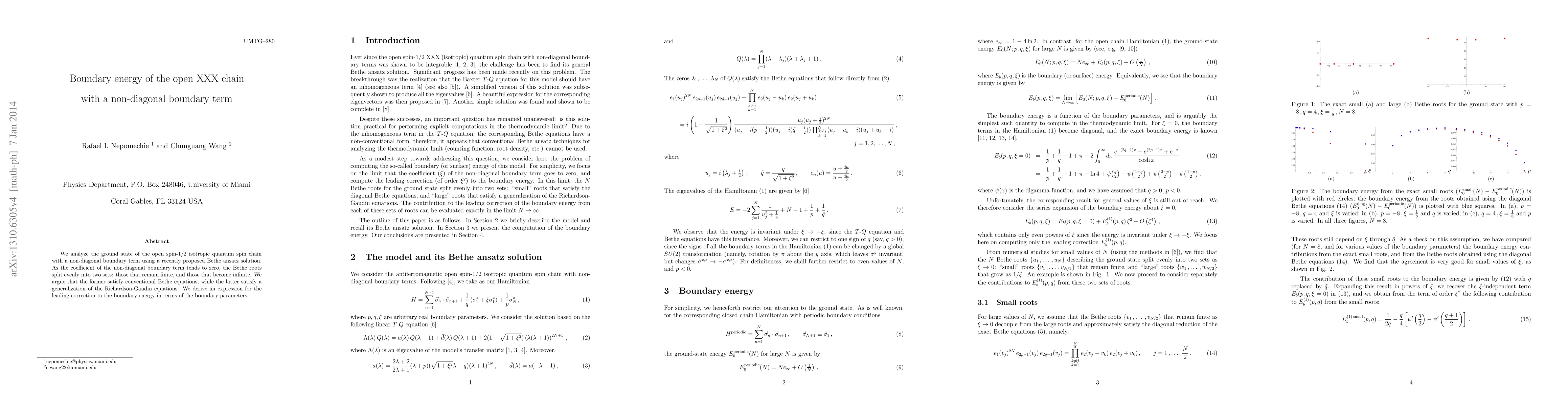 This paper investigates the ground state of an open spin-1/2 quantum spin chain with a non-diagonal boundary term, revealing that Bethe roots split into two sets as the non-diagonal coefficient approaches zero. The study derives an expression for the leading correction to the boundary energy, suggesting conventional and generalized equations for different root sets.