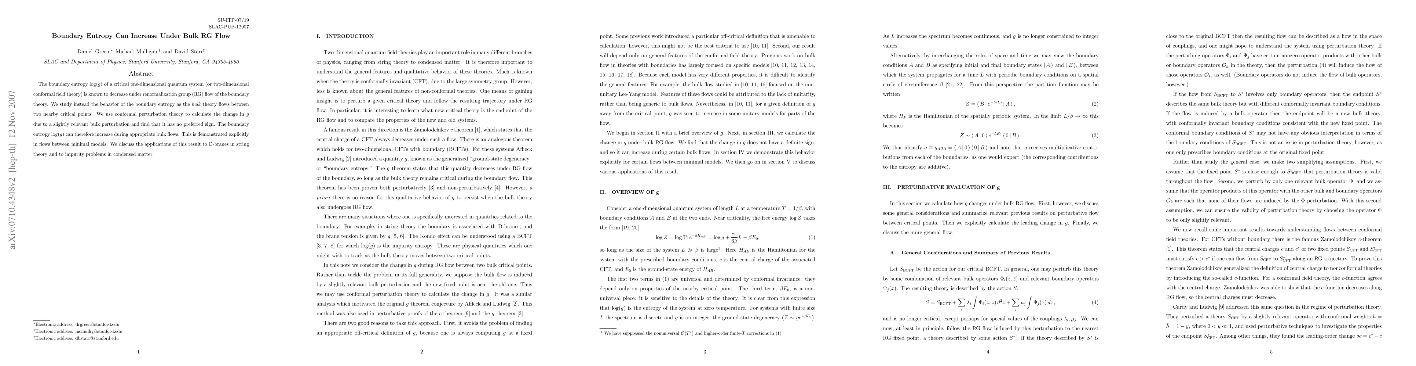 The boundary entropy log(g) in critical one-dimensional quantum systems can increase under bulk renormalization group flows, contrary to typical boundary theory flows, as shown using conformal perturbation theory in minimal models. This counterintuitive result has implications for D-branes in string theory and impurity problems in condensed matter physics.