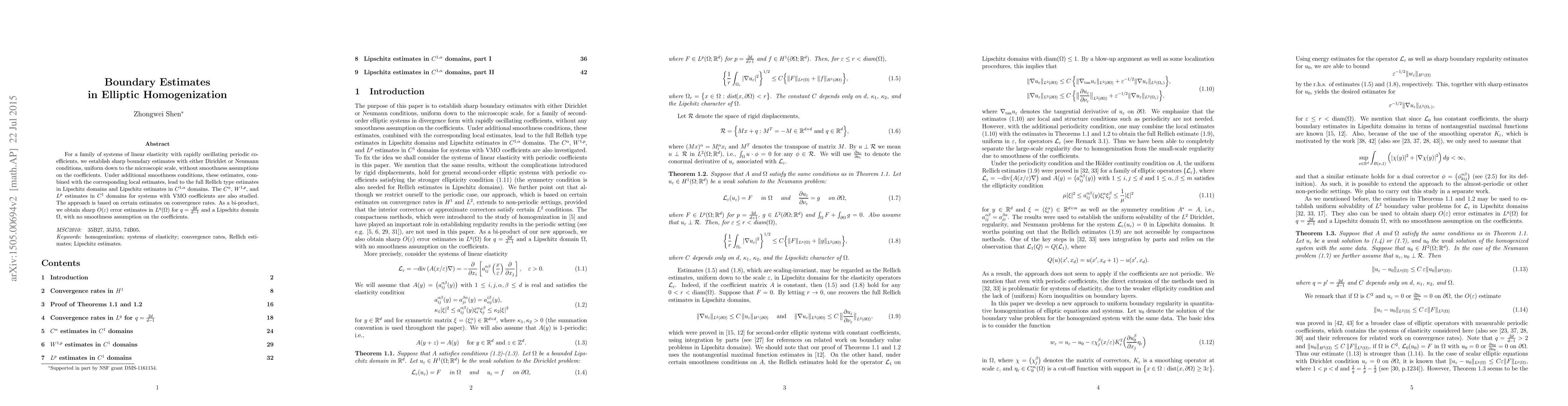 For a family of systems of linear elasticity with rapidly oscillating periodic coefficients, we establish sharp boundary estimates with either Dirichlet or Neumann conditions, uniform down to the microscopic scale, without smoothness assumptions on the coefficients. Under additional smoothness conditions, these estimates, combined with the corresponding local estimates, lead to the full Rellich type estimates in Lipschitz domains and Lipschitz estimates in $C^{1, \alpha}$ domains. The $C^\alpha$, $W^{1,p}$, and $L^p$ estimates in $C^1$ domains for systems with VMO coefficients are also studied. The approach is based on certain estimates on convergence rates. As a bi-product, we obtain sharp $O(\varepsilon)$ error estimates in $L^q(\Omega)$ for $q=\frac{2d}{d-1}$ and a Lipschitz domain $\Omega$, with no smoothness assumption on the coefficients.