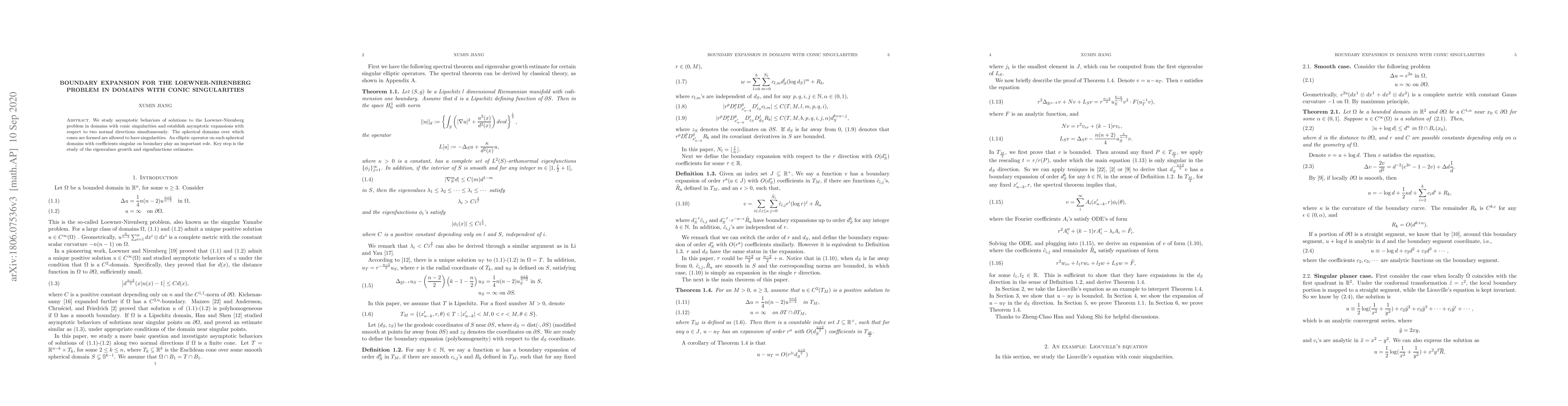 This paper studies the Loewner-Nirenberg problem in domains with conic singularities, establishing asymptotic expansions for solutions with respect to two normal directions simultaneously. The research focuses on eigenvalue growth and eigenfunction estimates.