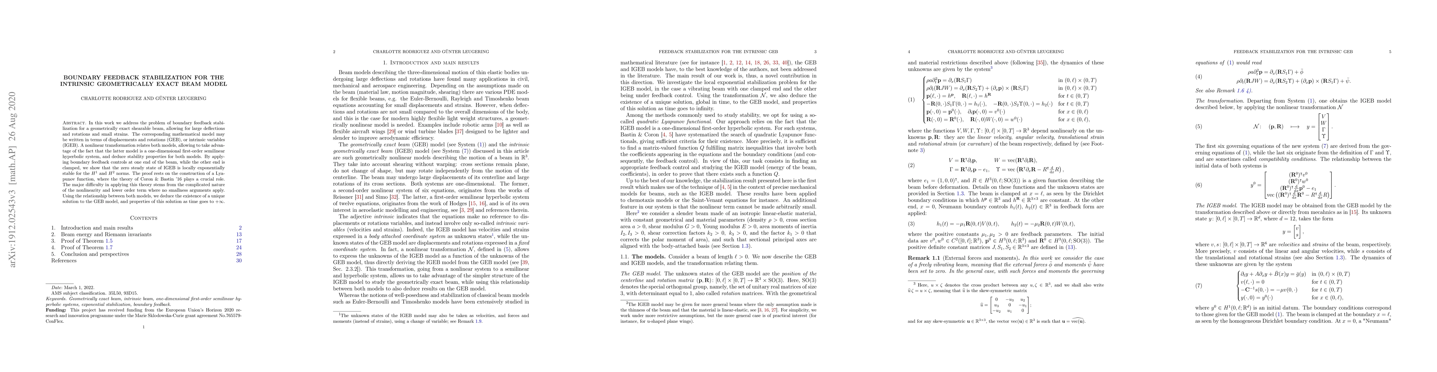 This paper investigates boundary feedback stabilization for a geometrically exact shearable beam model, demonstrating local exponential stability for both displacement-rotation and intrinsic variable models. The stability proof leverages a Lyapunov function and the nonlinear transformation between the two models, overcoming challenges posed by the beam's nonlinearities.