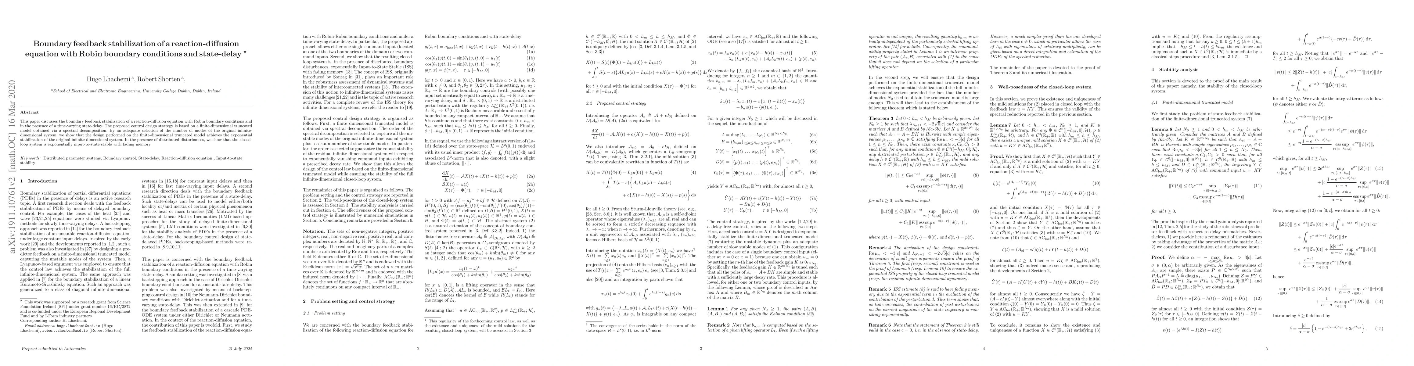 This paper discusses the boundary feedback stabilization of a reaction-diffusion equation with Robin boundary conditions and in the presence of a time-varying state-delay. The proposed control design strategy is based on a finite-dimensional truncated model obtained via a spectral decomposition. By an adequate selection of the number of modes of the original infinite-dimensional system, we show that the design performed on the finite-dimensional truncated model achieves the exponential stabilization of the original infinite-dimensional system. In the presence of distributed disturbances, we show that the closed-loop system is exponentially input-to-state stable with fading memory.