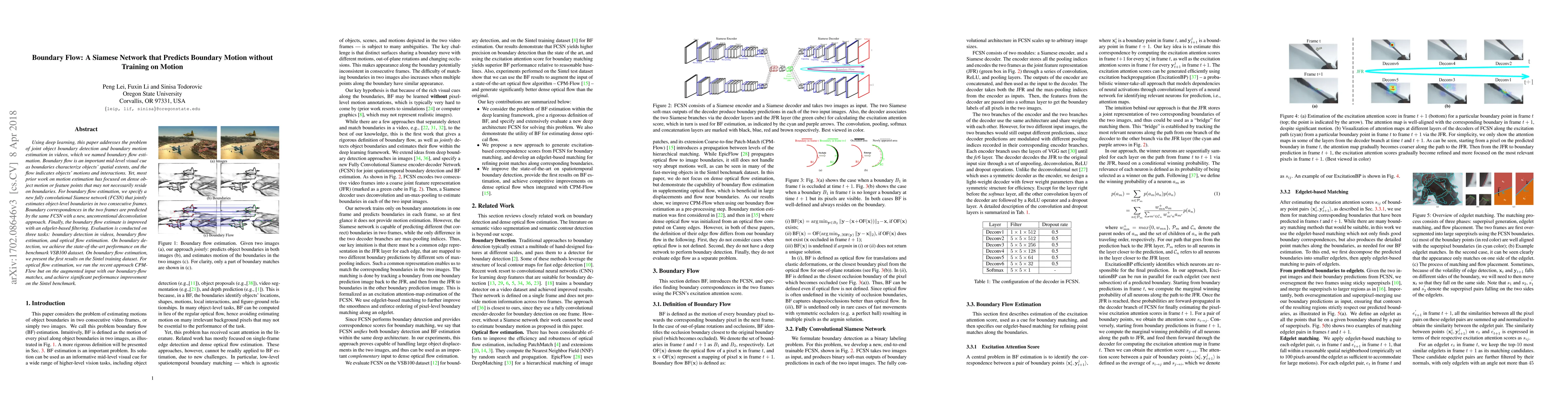 Using deep learning, this paper addresses the problem of joint object boundary detection and boundary motion estimation in videos, which we named boundary flow estimation. Boundary flow is an important mid-level visual cue as boundaries characterize objects spatial extents, and the flow indicates objects motions and interactions. Yet, most prior work on motion estimation has focused on dense object motion or feature points that may not necessarily reside on boundaries. For boundary flow estimation, we specify a new fully convolutional Siamese network (FCSN) that jointly estimates object-level boundaries in two consecutive frames. Boundary correspondences in the two frames are predicted by the same FCSN with a new, unconventional deconvolution approach. Finally, the boundary flow estimate is improved with an edgelet-based filtering. Evaluation is conducted on three tasks: boundary detection in videos, boundary flow estimation, and optical flow estimation. On boundary detection, we achieve the state-of-the-art performance on the benchmark VSB100 dataset. On boundary flow estimation, we present the first results on the Sintel training dataset. For optical flow estimation, we run the recent approach CPMFlow but on the augmented input with our boundary-flow matches, and achieve significant performance improvement on the Sintel benchmark.