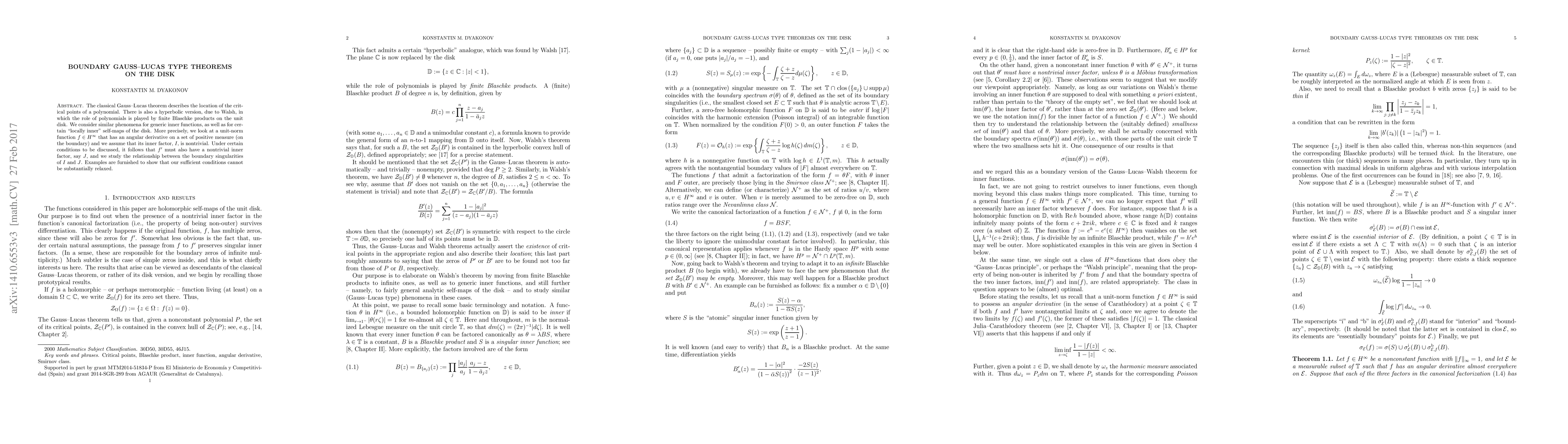 The classical Gauss--Lucas theorem describes the location of the critical points of a polynomial. There is also a hyperbolic version, due to Walsh, in which the role of polynomials is played by finite Blaschke products on the unit disk. We consider similar phenomena for generic inner functions, as well as for certain "locally inner" self-maps of the disk. More precisely, we look at a unit-norm function $f\in H^\infty$ that has an angular derivative on a set of positive measure (on the boundary) and we assume that its inner factor, $I$, is nontrivial. Under certain conditions to be discussed, it follows that $f'$ must also have a nontrivial inner factor, say $J$, and we study the relationship between the boundary singularities of $I$ and $J$. Examples are furnished to show that our sufficient conditions cannot be substantially relaxed.