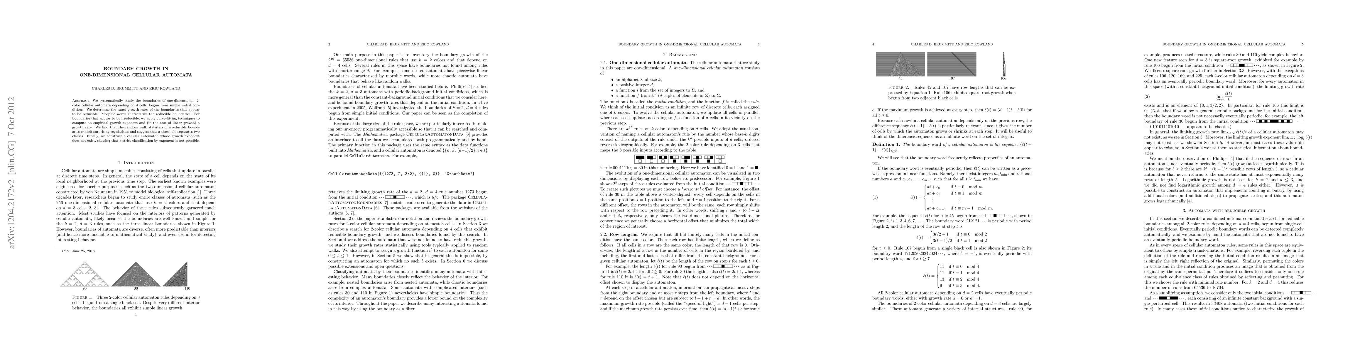 We systematically study the boundaries of one-dimensional, 2-color cellular automata depending on 4 cells, begun from simple initial conditions. We determine the exact growth rates of the boundaries that appear to be reducible. Morphic words characterize the reducible boundaries. For boundaries that appear to be irreducible, we apply curve-fitting techniques to compute an empirical growth exponent and (in the case of linear growth) a growth rate. We find that the random walk statistics of irreducible boundaries exhibit surprising regularities and suggest that a threshold separates two classes. Finally, we construct a cellular automaton whose growth exponent does not exist, showing that a strict classification by exponent is not possible.