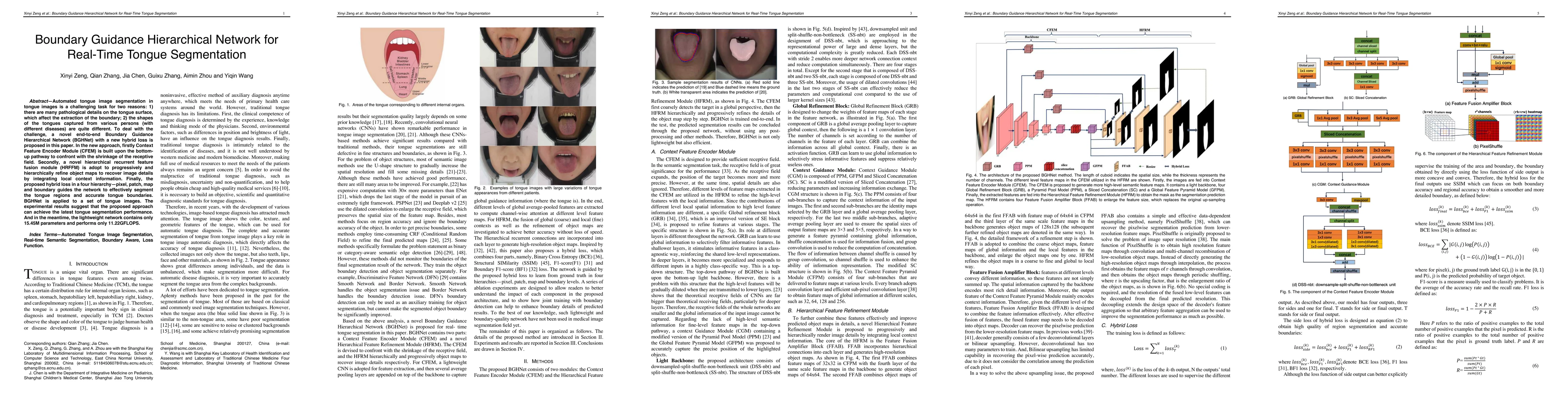 Automated tongue image segmentation in tongue images is a challenging task for two reasons: 1) there are many pathological details on the tongue surface, which affect the extraction of the boundary; 2) the shapes of the tongues captured from various persons (with different diseases) are quite different. To deal with the challenge, a novel end-to-end Boundary Guidance Hierarchical Network (BGHNet) with a new hybrid loss is proposed in this paper. In the new approach, firstly Context Feature Encoder Module (CFEM) is built upon the bottomup pathway to confront with the shrinkage of the receptive field. Secondly, a novel hierarchical recurrent feature fusion module (HRFFM) is adopt to progressively and hierarchically refine object maps to recover image details by integrating local context information. Finally, the proposed hybrid loss in a four hierarchy-pixel, patch, map and boundary guides the network to effectively segment the tongue regions and accurate tongue boundaries. BGHNet is applied to a set of tongue images. The experimental results suggest that the proposed approach can achieve the latest tongue segmentation performance. And in the meantime, the lightweight network contains only 15.45M parameters and performs only 11.22GFLOPS.