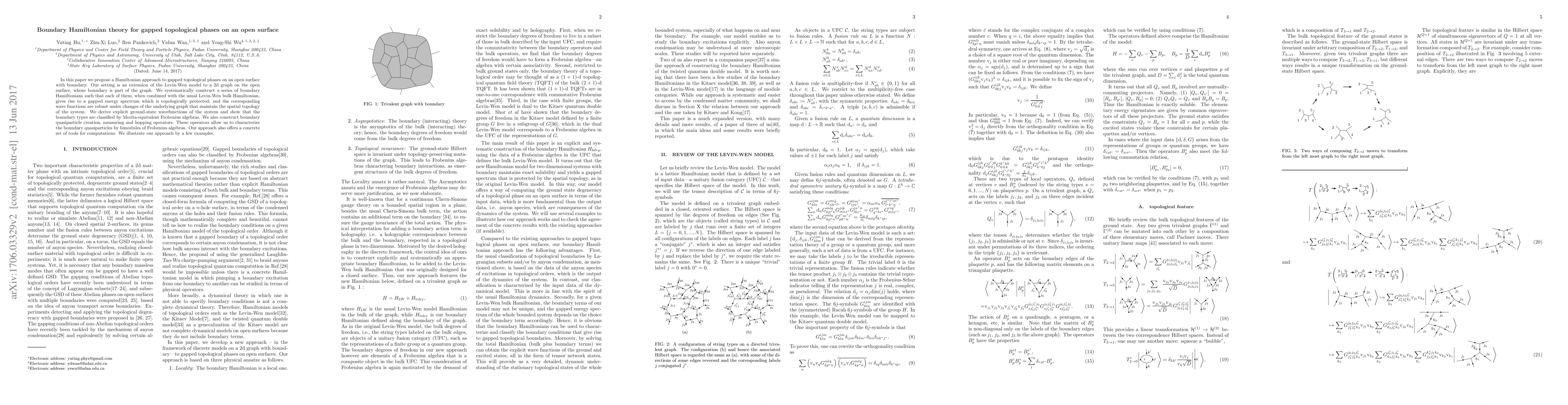 In this paper we propose a Hamiltonian approach to gapped topological phases on an open surface with boundary. Our setting is an extension of the Levin-Wen model to a 2d graph on the open surface, whose boundary is part of the graph. We systematically construct a series of boundary Hamiltonians such that each of them, when combined with the usual Levin-Wen bulk Hamiltonian, gives rise to a gapped energy spectrum which is topologically protected; and the corresponding wave functions are robust under changes of the underlying graph that maintain the spatial topology of the system. We derive explicit ground-state wavefunctions of the system and show that the boundary types are classified by Morita-equivalent Frobenius algebras. We also construct boundary quasiparticle creation, measuring and hopping operators. These operators allow us to characterize the boundary quasiparticles by bimodules of Frobenius algebras. Our approach also offers a concrete set of tools for computations. We illustrate our approach by a few examples.